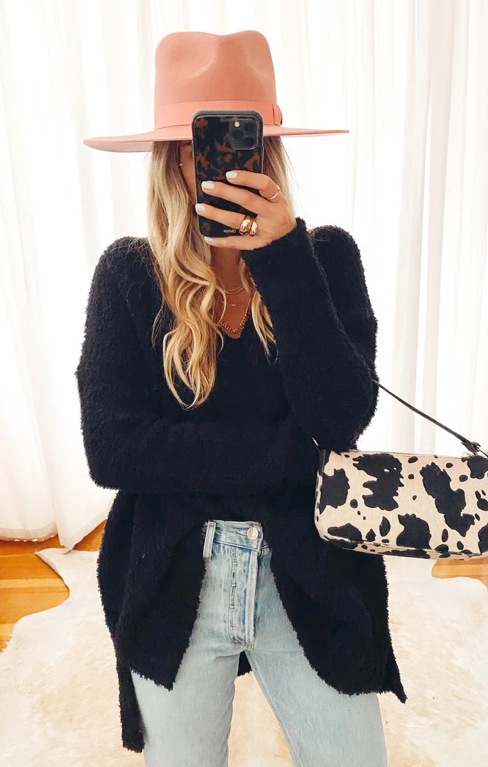 The oversized sweater that every girl needs in her closet! This fuzzy black sweater has a v-cut neckline, two side slits and a high-low hem.