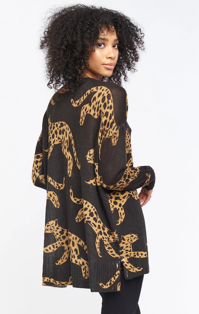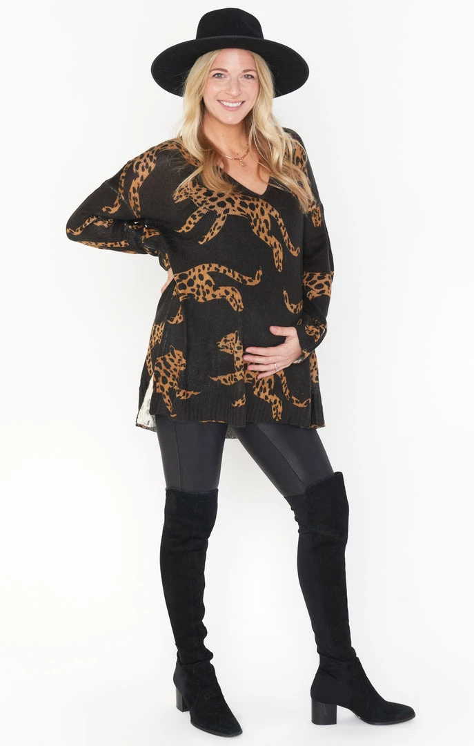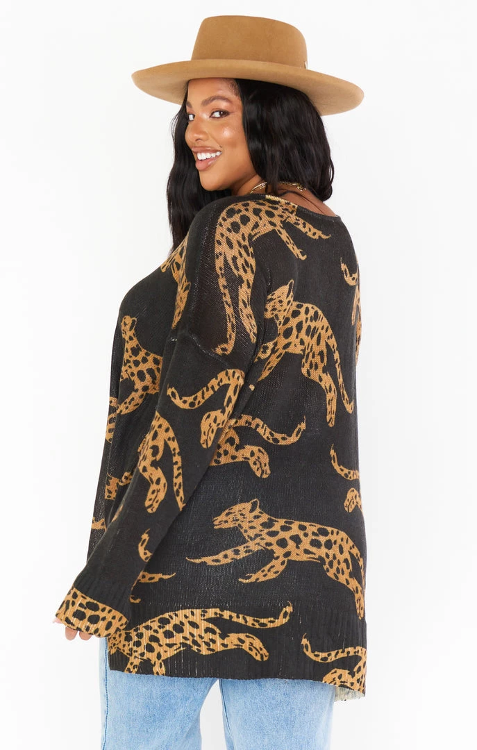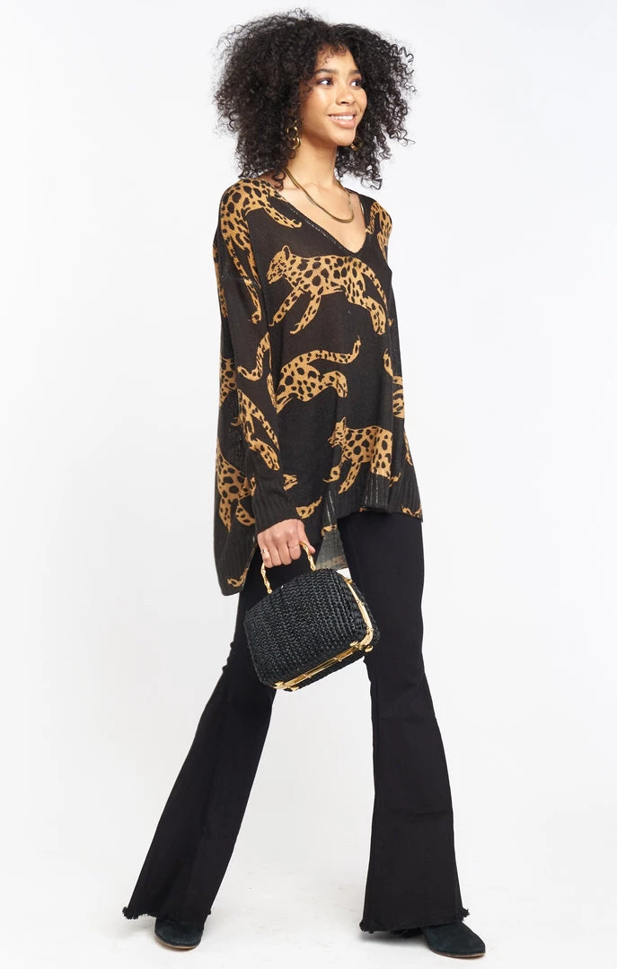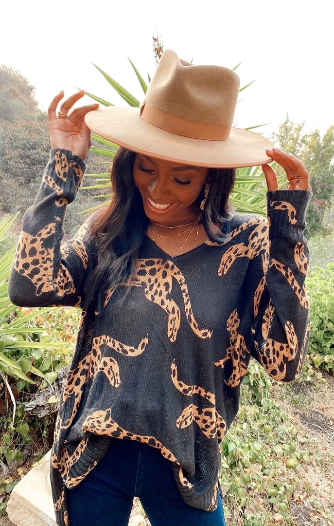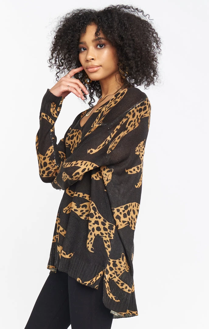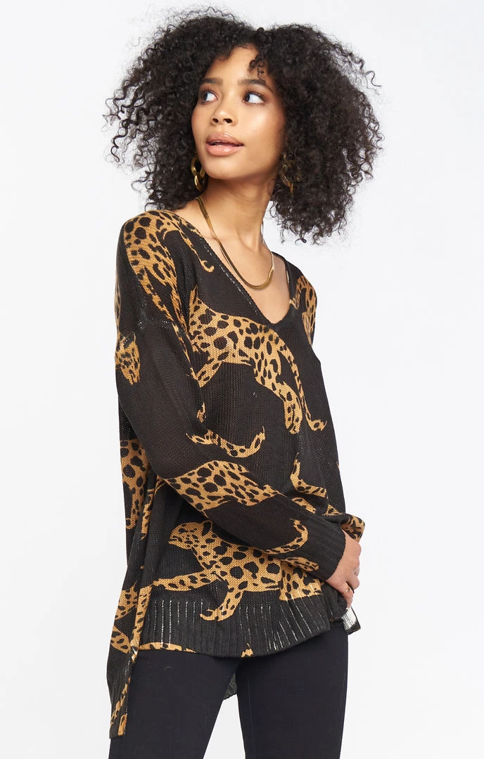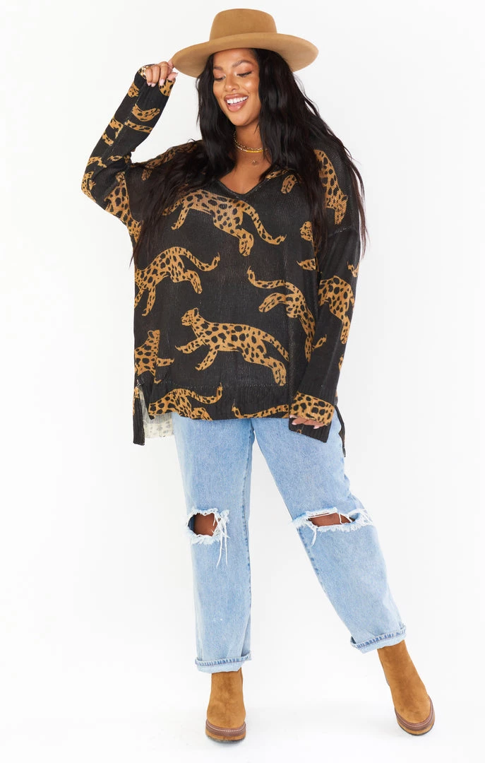 The oversized sweater that every girl needs in her closet! This cheetah print sweater has a v-cut neckline, two side slits and a high-low hem