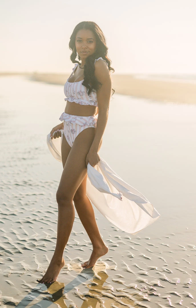 This pink and white striped bikini bottom is a go-to for your next beach or pool day! The Island Ruffle bottom has a high waist accented with a ruffle and a medium coverage cut for a flattering bottom you’ll want to wear to any occasion.