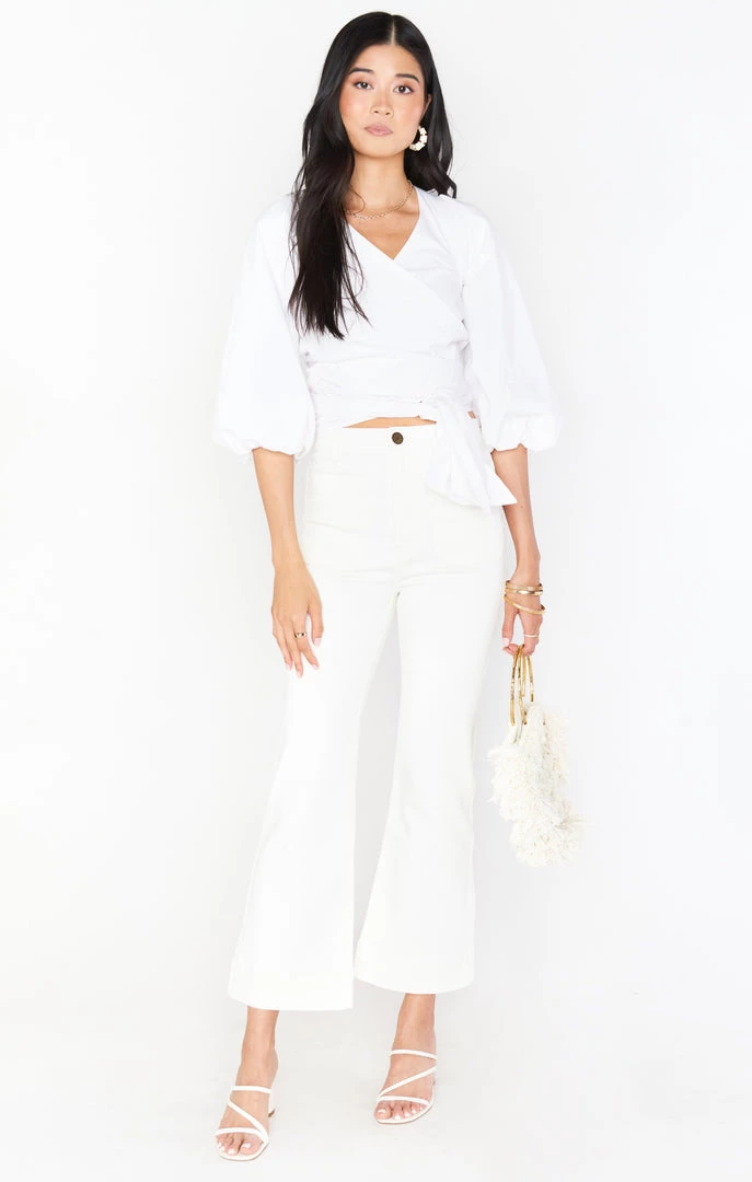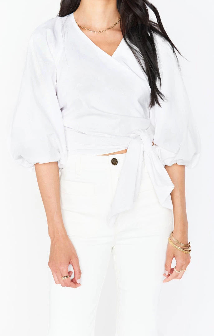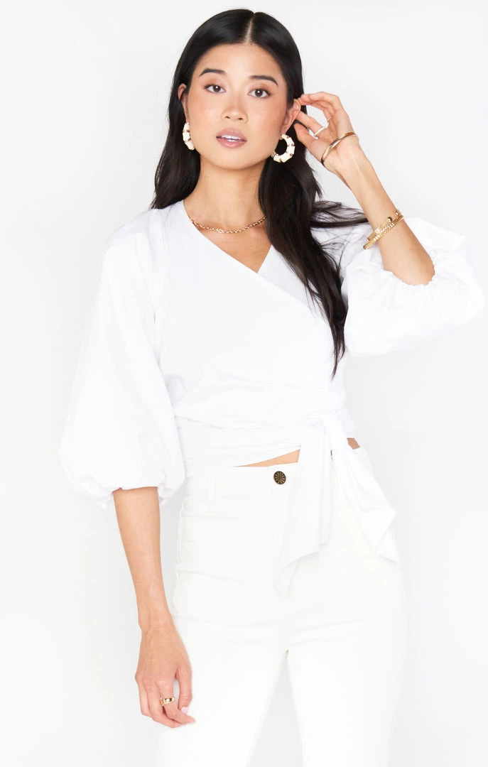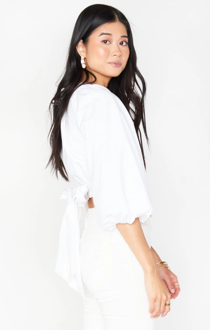 Puff sleeve heaven in this white front-tie cropped blouse. Pair with a skirt and heels for all your brunching needs, or dress down with your fave Mumu denim and sneaks.