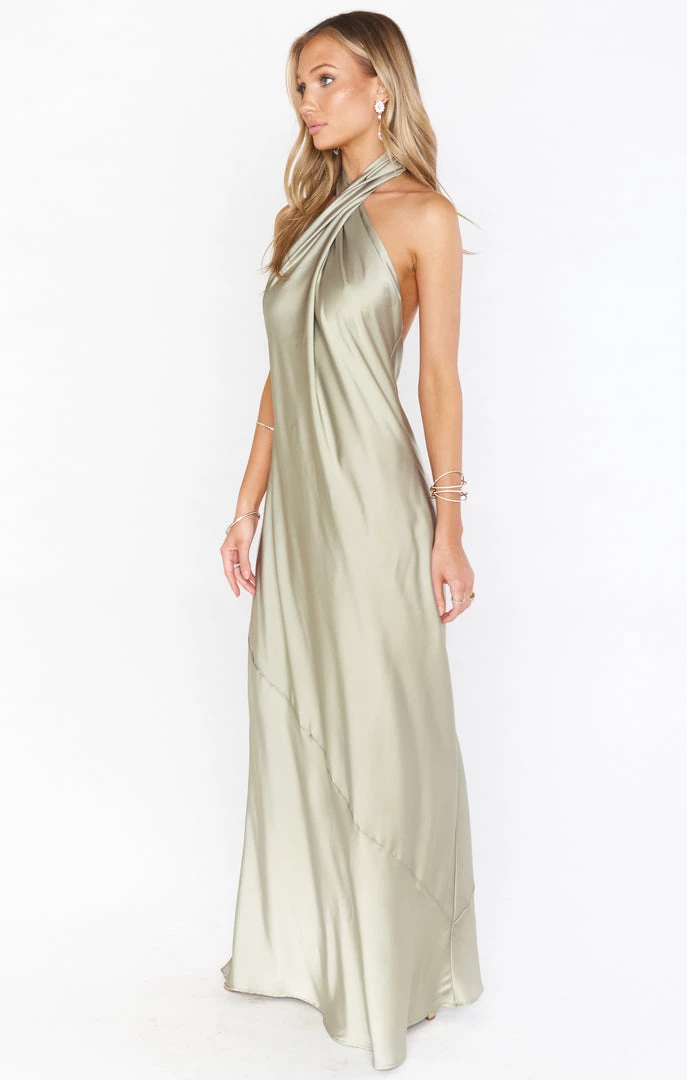 Show Me Your Mumu Jasmine Halter Maxi Dress ~ Moss Green Luxe Satin