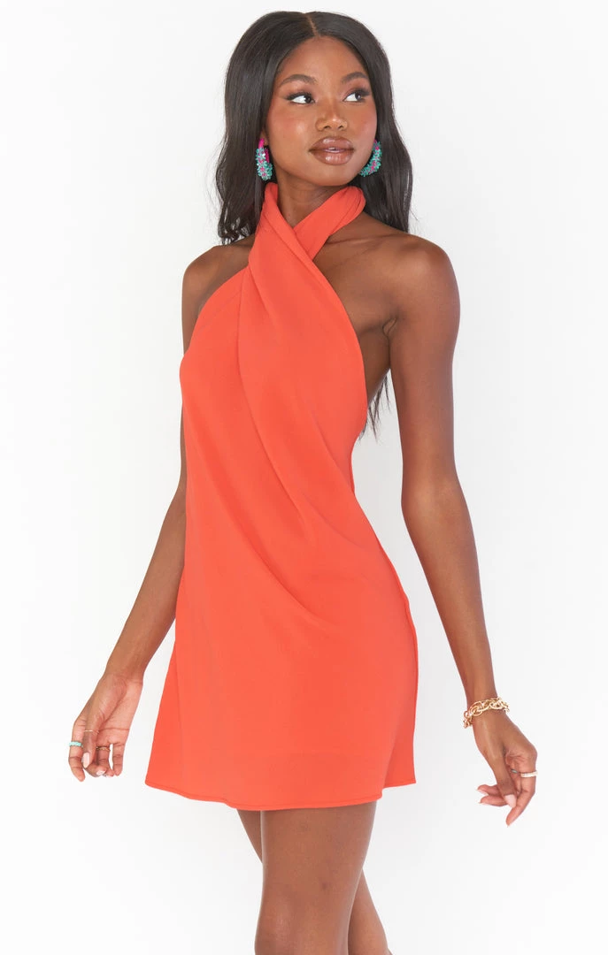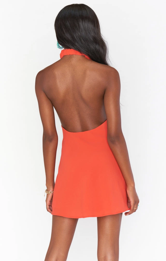Our best selling halter maxi is now in mini length! This red mini is cut on the bias to give that perfect slip draping we’re all looking for. The top softly wraps around your neck for a flattering high neck and leaves a dramatic open back. A new go-to for special occasions and a vacay date night!