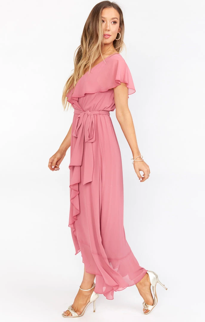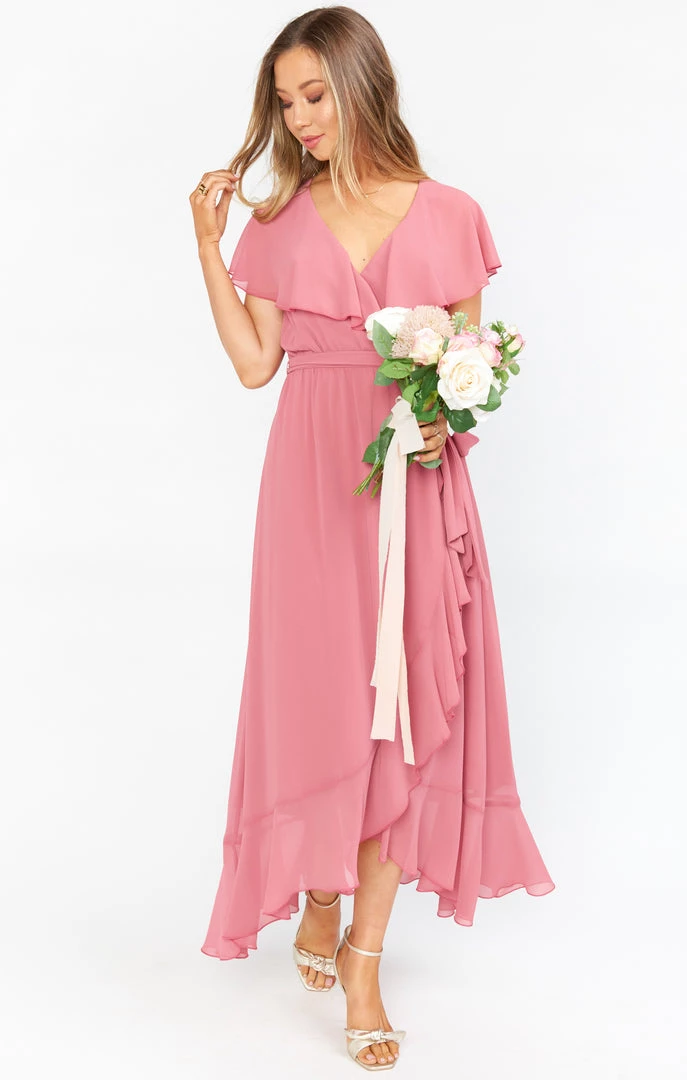 Show Me Your Mumu Jess Ruffle Midi Dress ~ Sunset Rose Chiffon Bridesmaids Dresses