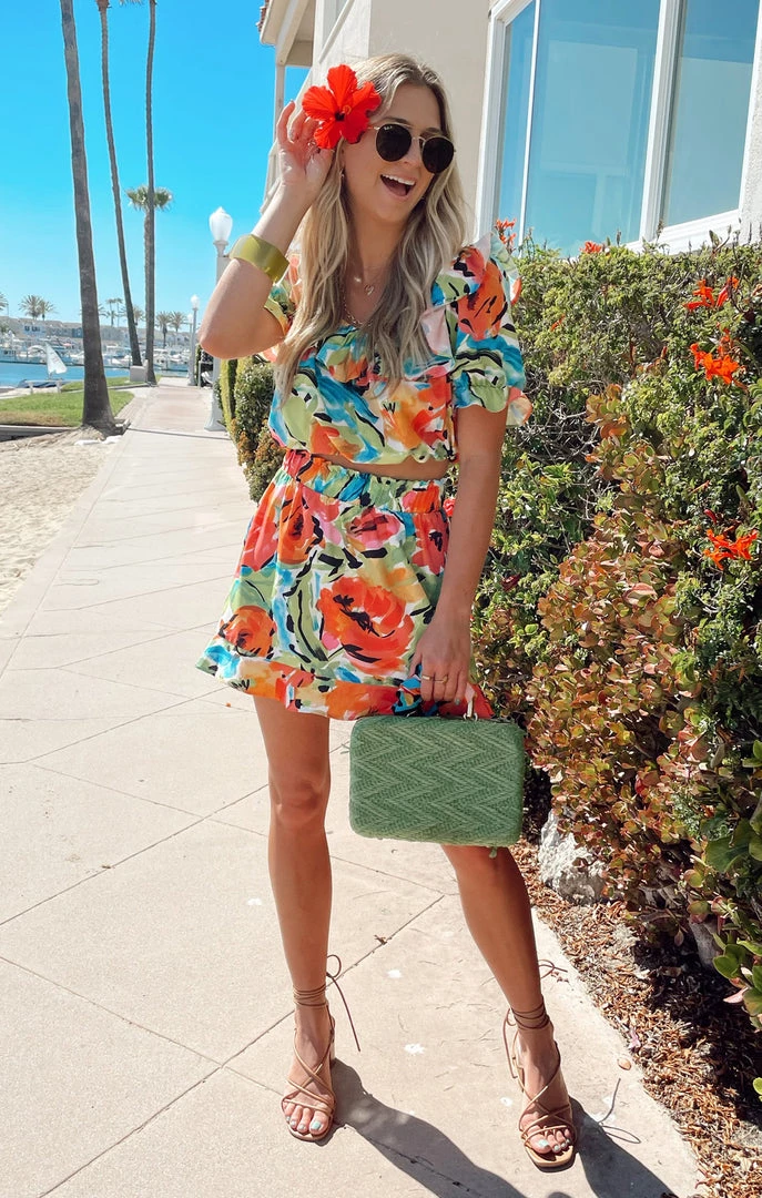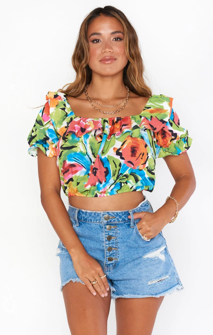 Girls trip ready in this bright floral, lightweight crop top. Ruffled tier and puff sleeve take this from basic to babe! Wear with the matching Roman Ruffle Skirt for the full look or simplify with your fave pair of Mumu denim.