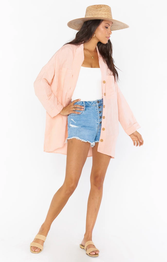 The Johns Button Down is an oversized breezy pink linen shirt with a comfy and flowy fit, this shirt has oversized pockets in front and a raw-edged hem that is ready for summer! Pair this button-down with your fave MUMU denim shorts, bells, or with a linen Iva Skirt for an easy outfit!