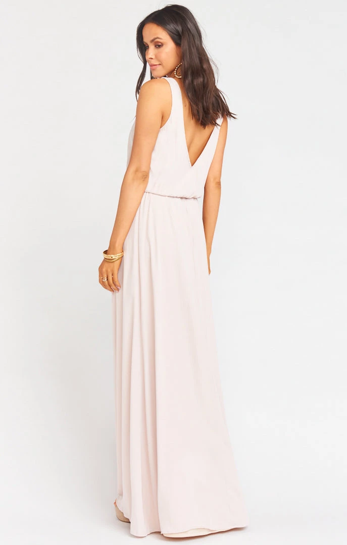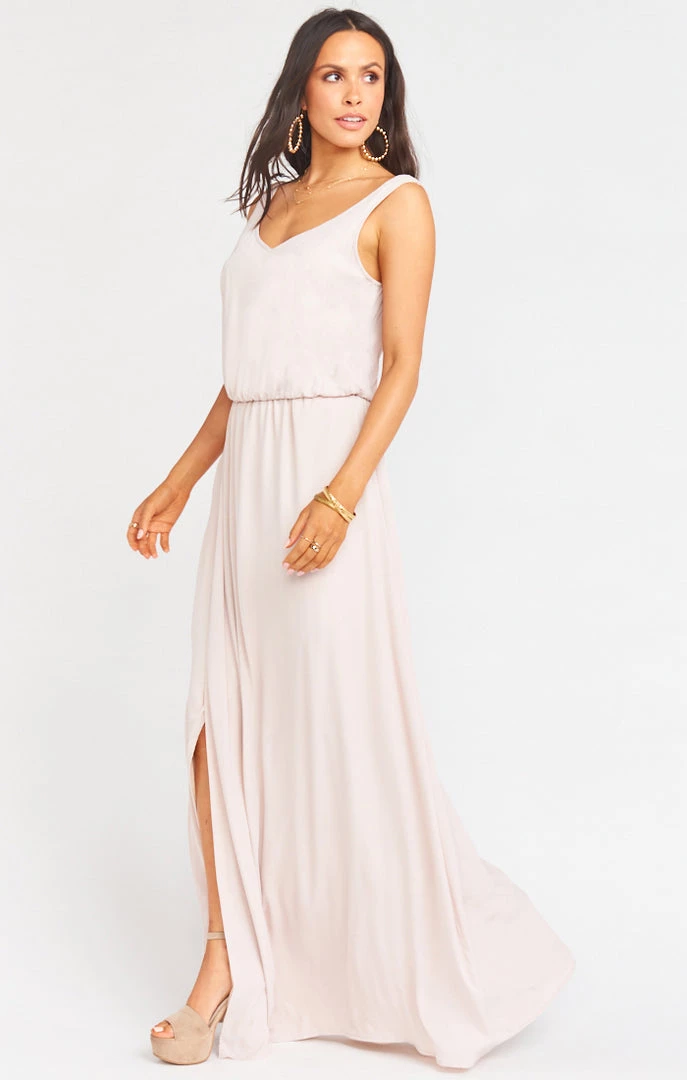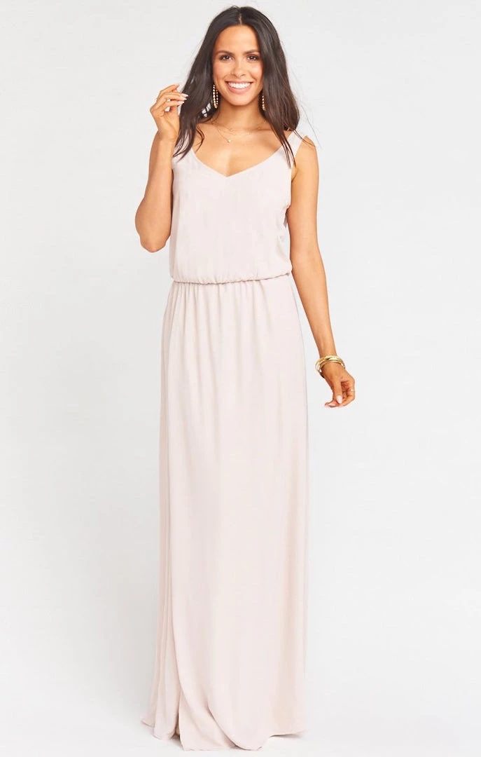 The Kendall Maxi is a soft v-neck and low back are ultra feminine and flattering maxi. Petite body types and shorter torsos may require alternations to shorten the straps on this style.