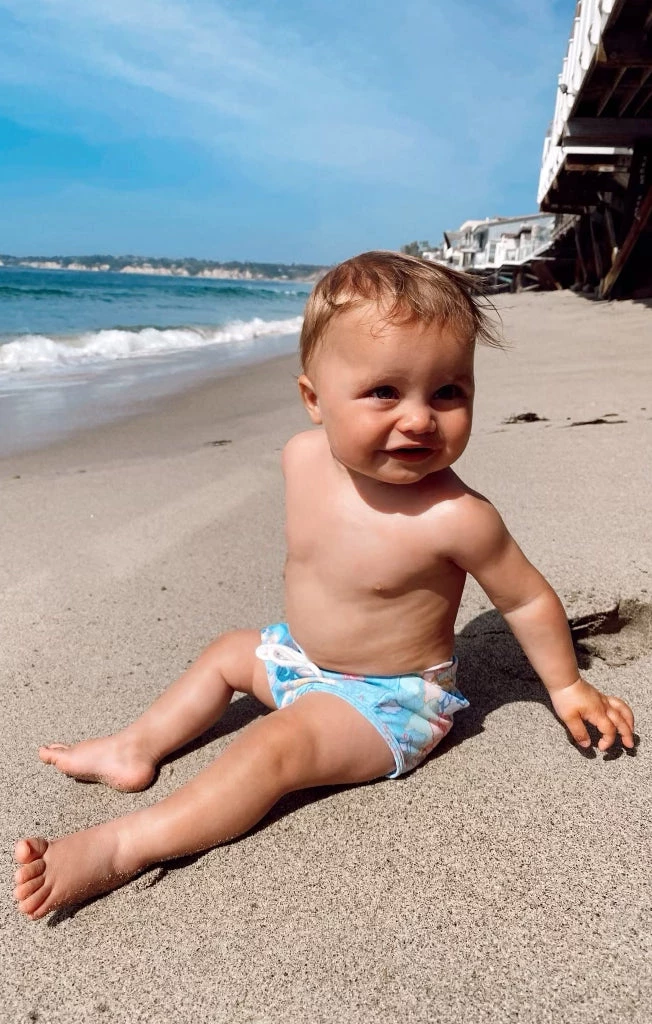 Your baby will be looking cute around the workd in these new swim shorts. These shorts have an elastic waist with a drawstring. Match your mama in her new World Tour print swim!