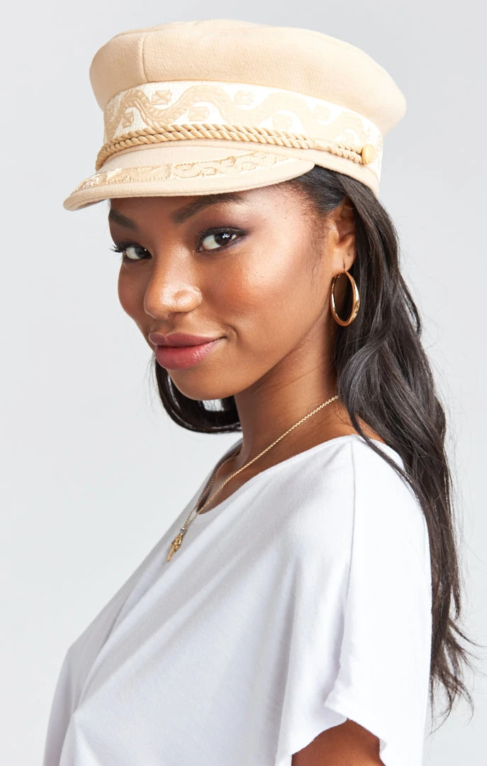 The Riviera Cap is a chic, vintage inspired sailor cap that can be paired with any outfit to make a statement. Trimmed with sailor button details, braided rope and vintage Gonzo ribbon.