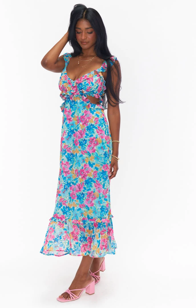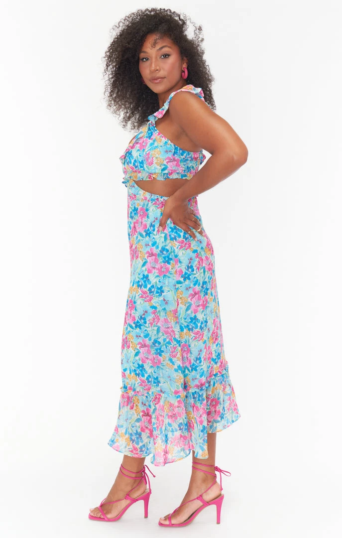 Be summer soiree ready in our Garden Girls Lane Midi Dress. Ruffled straps and v-neckline meet flirty side cutouts before ending at a ruffled midi hem. Head out in strappy heels and dainty jewelry for a best dressed guest look.