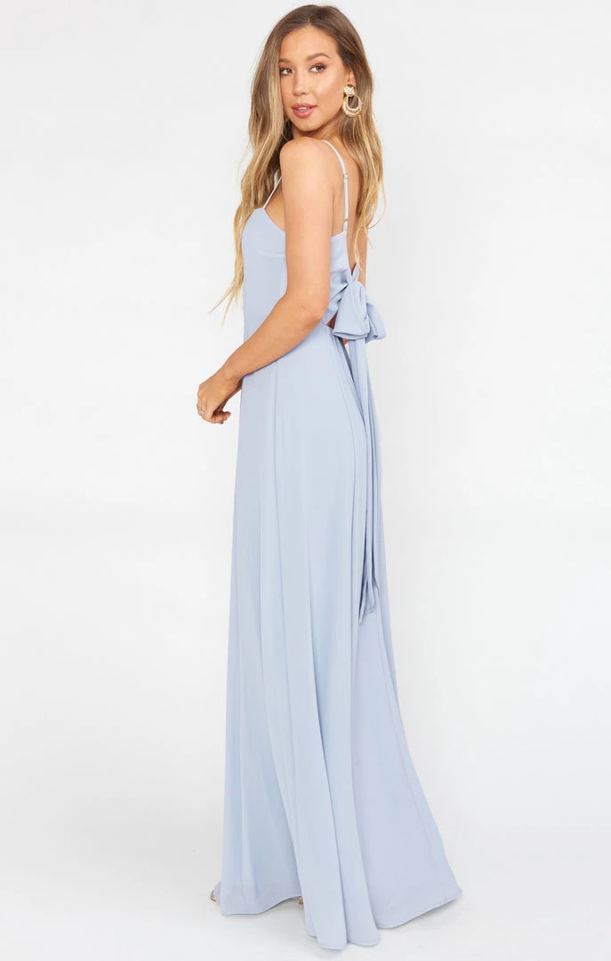 The Lauren Tie Maxi Dress is a beautifully simple silhouette with a chic bow statement in the back. Her slight empire waist proves flattering for a variety of bodies met with a full length skirt. Because her bow is self tied in the back, you are able to tighten her a little more if more support is needed in the bust.