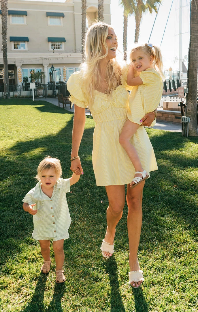 It fills our cup that you’re about to create core memories wearing a collection we had the pleasure to design with Sabrina Chazen. We envision generations matching in these happy frocks. Bows, lemons, and stripes forever! Cheers to you – may this collab put a spring back in your step!