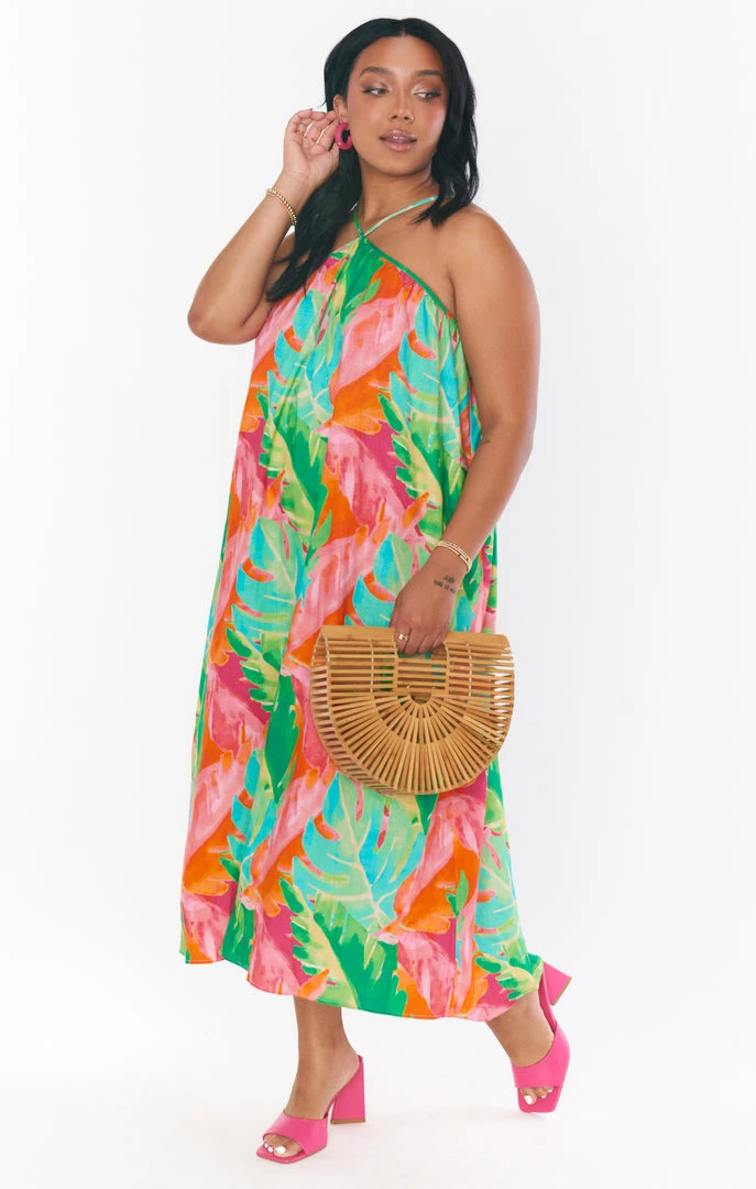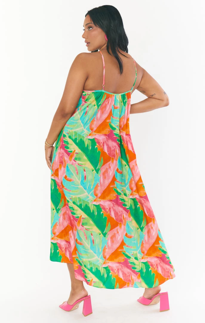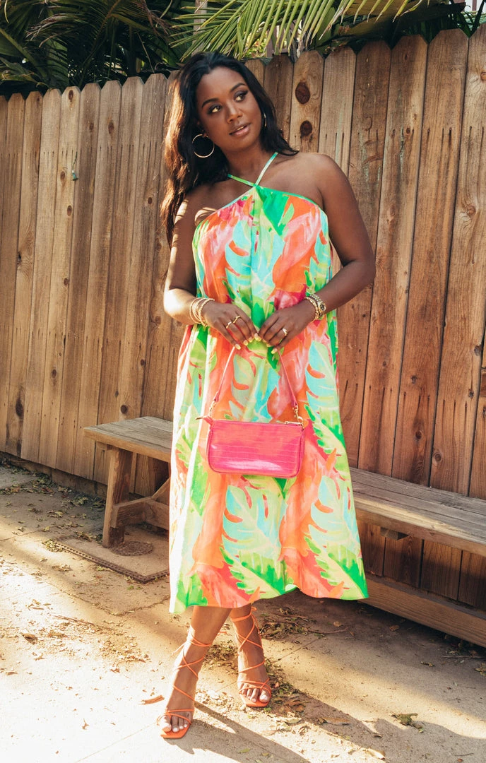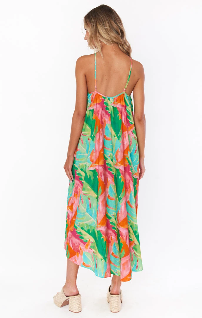 Bright and just right, this flowing rainbow palm midi dress is a need not a want! A flattering high neck meets adjustable straps to ensure the perfect fit. The high-low hem adds dimension making this special enough for all this seasons occasions.