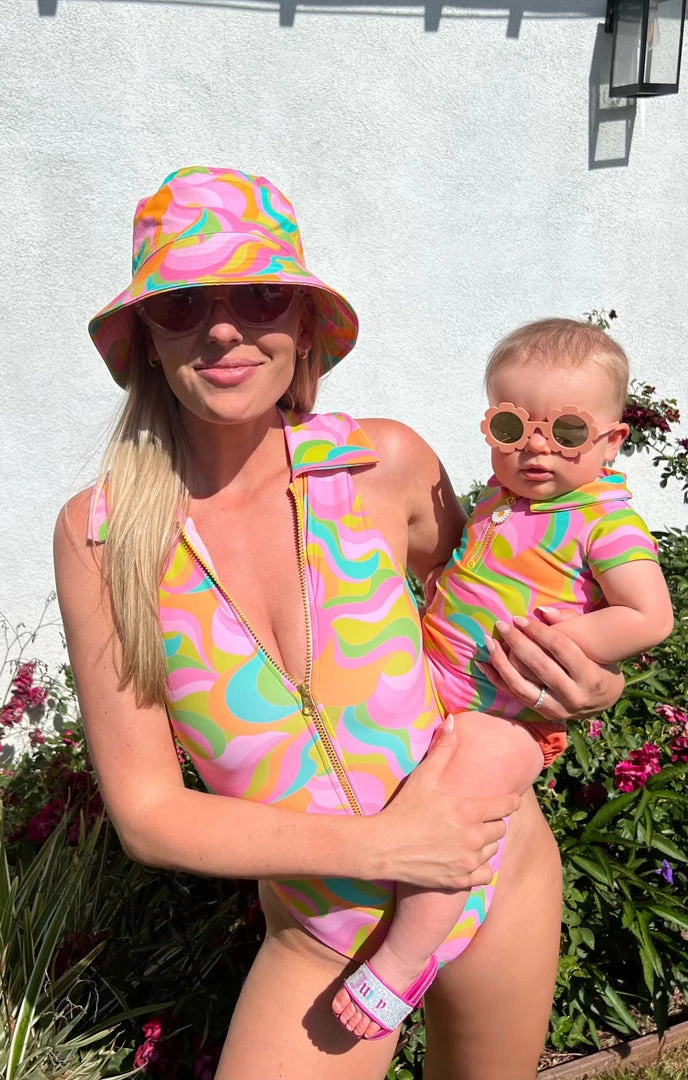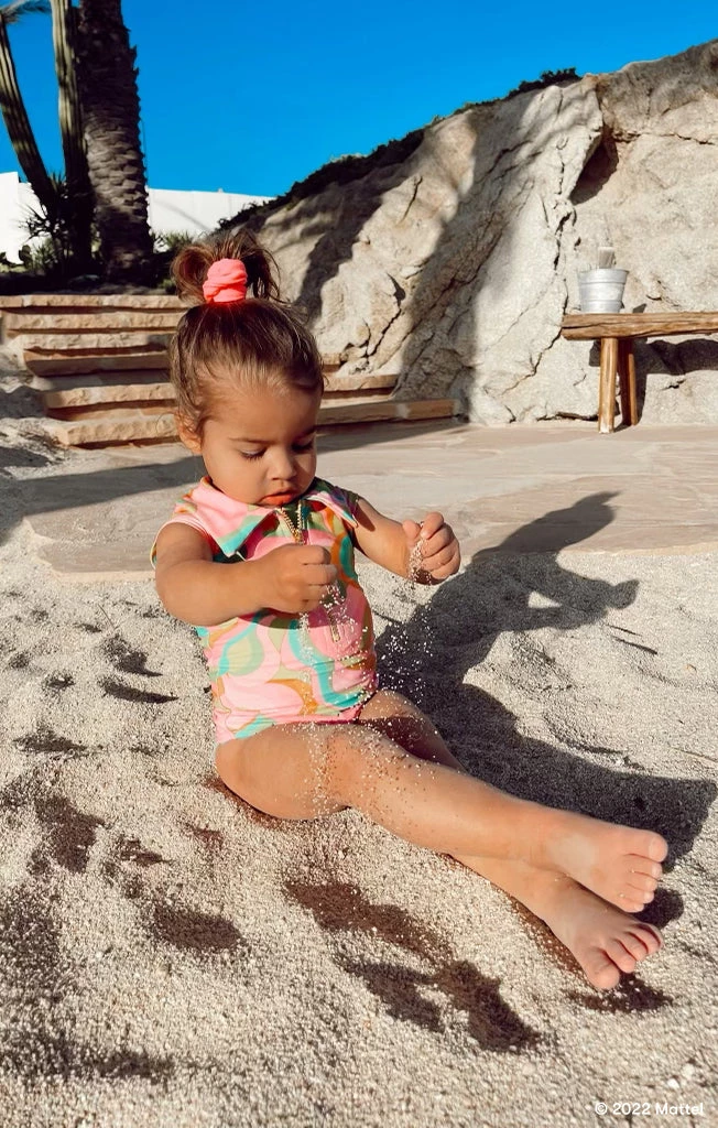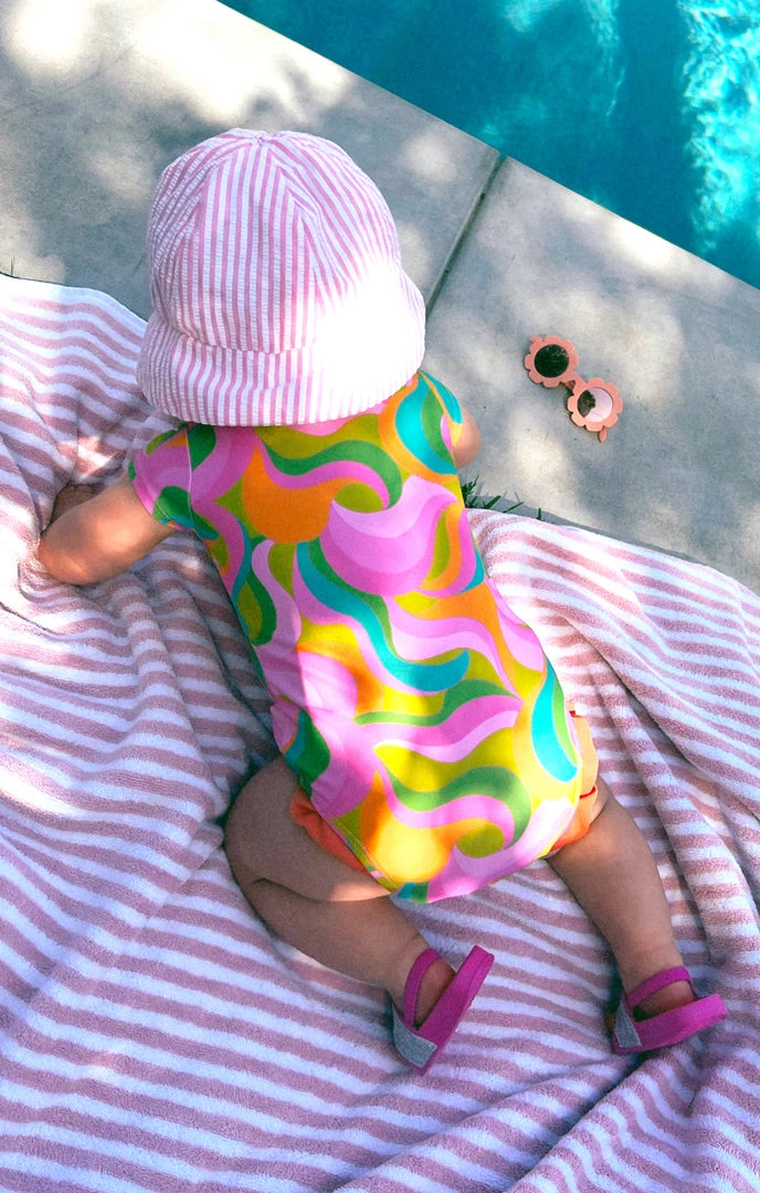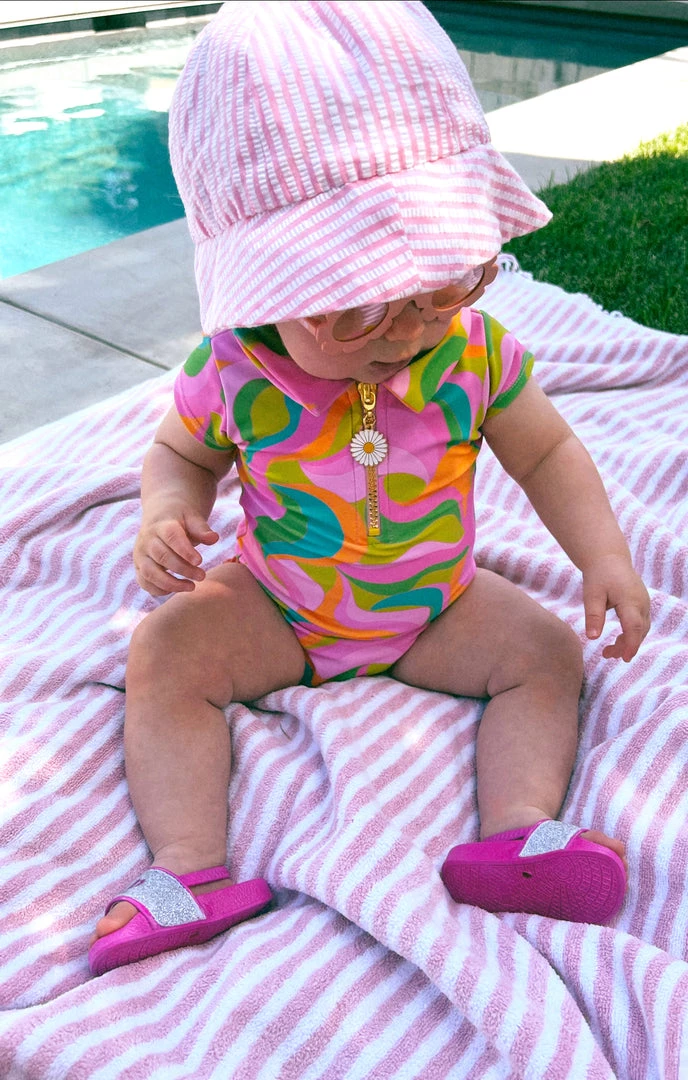 Sandy smiles in this rainbow wave one piece. Darling details like a retro collar and gold zipper sets this kids swimmie apart from the rest!