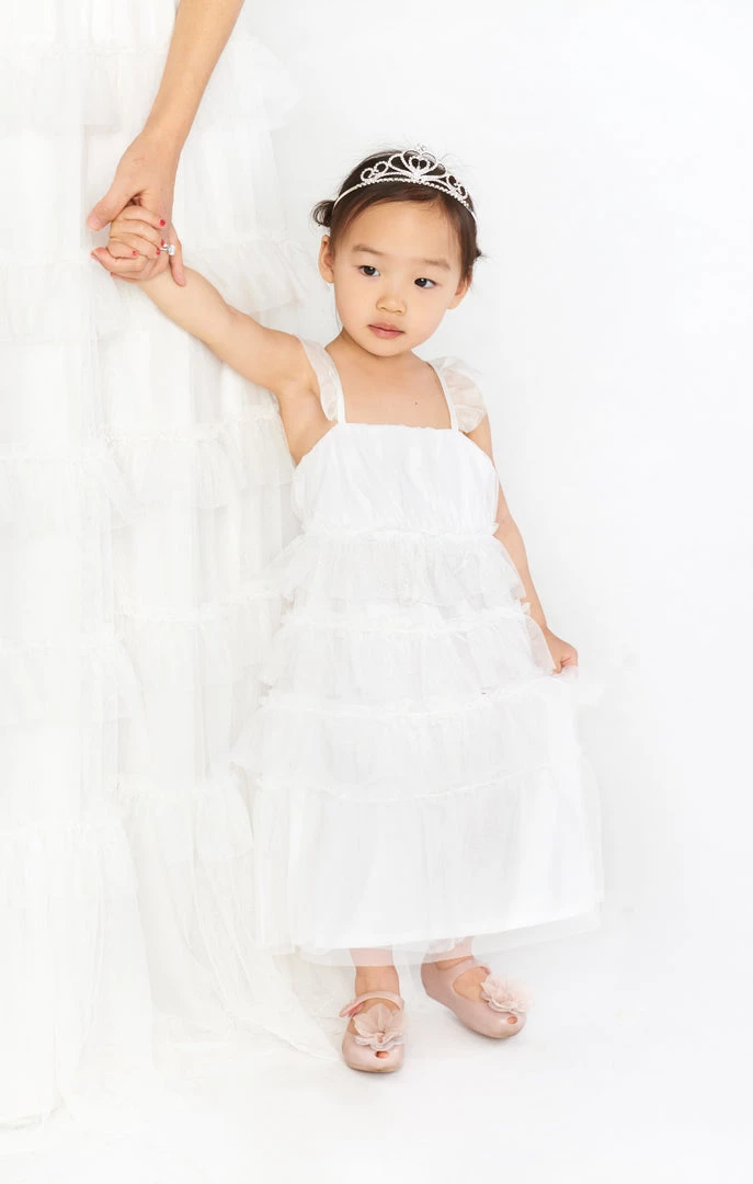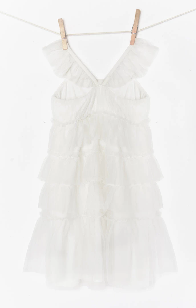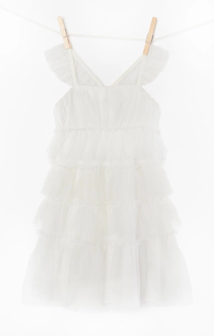 This whimsical dress has tiered ruffles throughout and a flutter ruffle strap. Cinched at the top with elastic this is the perfect dress to throw on your little one for any special occasion. She will feel light and airy in this little tulle dress.