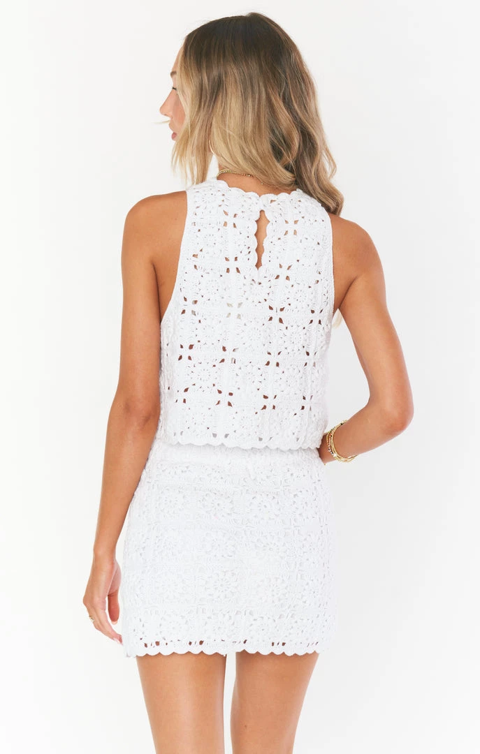 This too-cute-to-be-true white crochet mini skirt will bring all the smiles! The elastic waistband ensures the perfect fit, while the crochet detailing sets it apart from the crowd. Toss over your swim for those sunshiney beach days, or match with the Lucy Top for the full retro look.