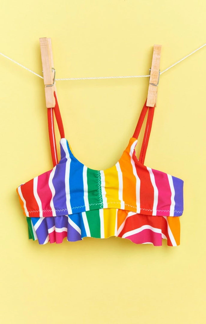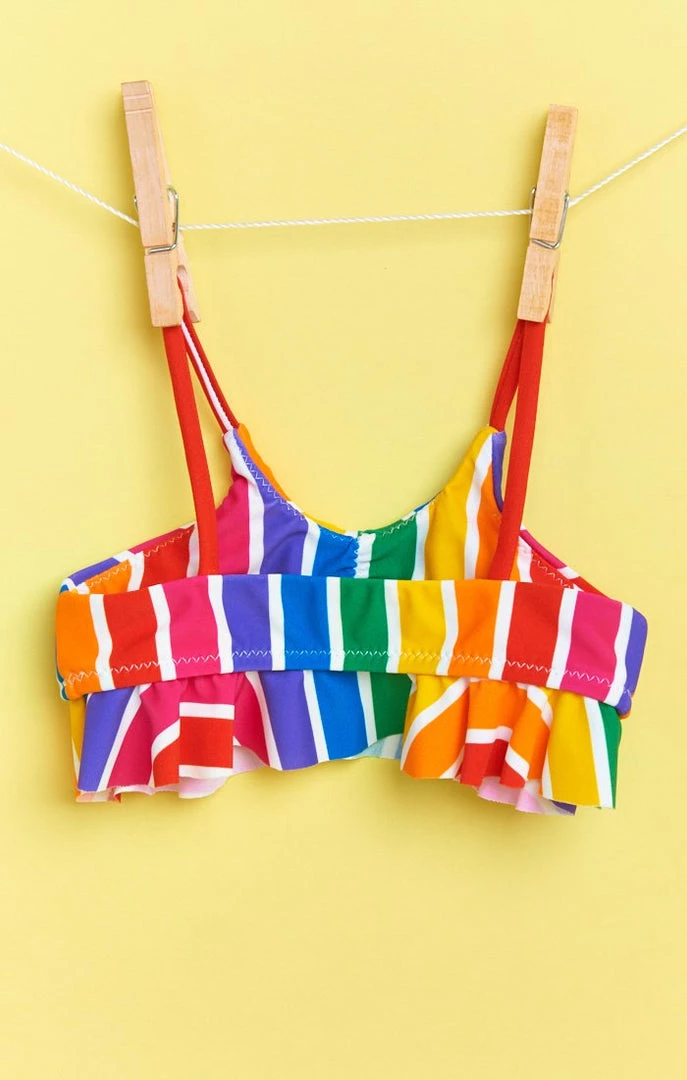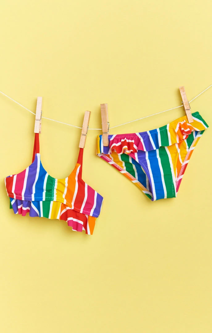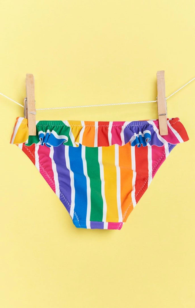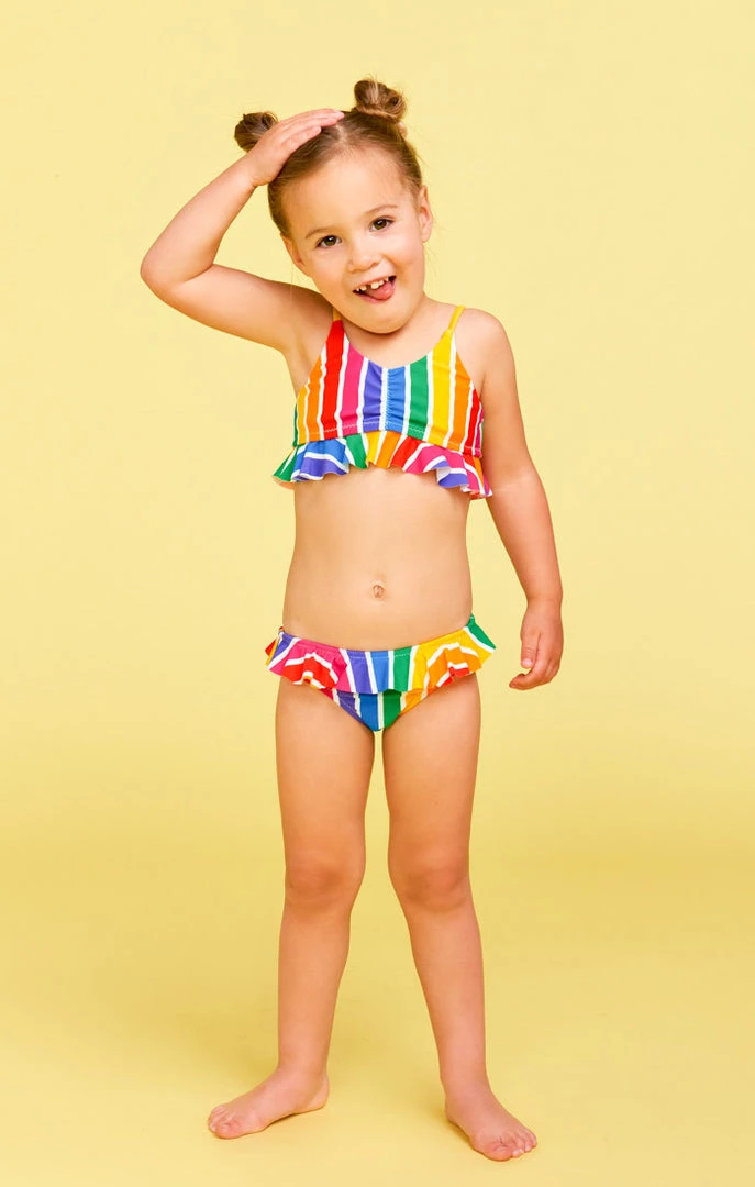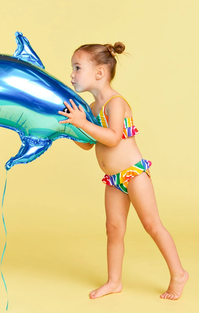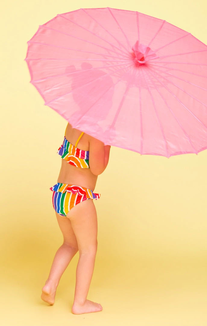 The cutest two piece for your little mini me! Match perfectly with your baby in this rainbow two piece. This style features ruffle detailing and elastic lining.