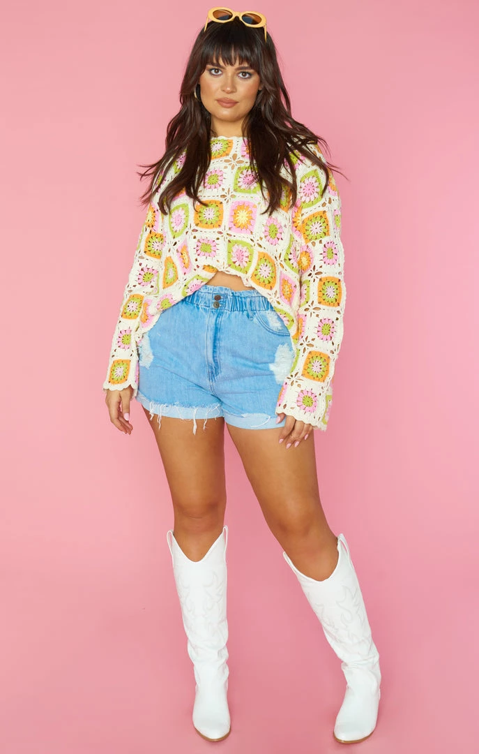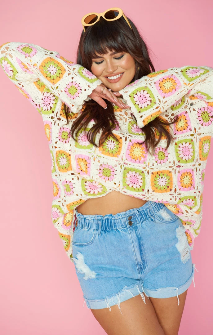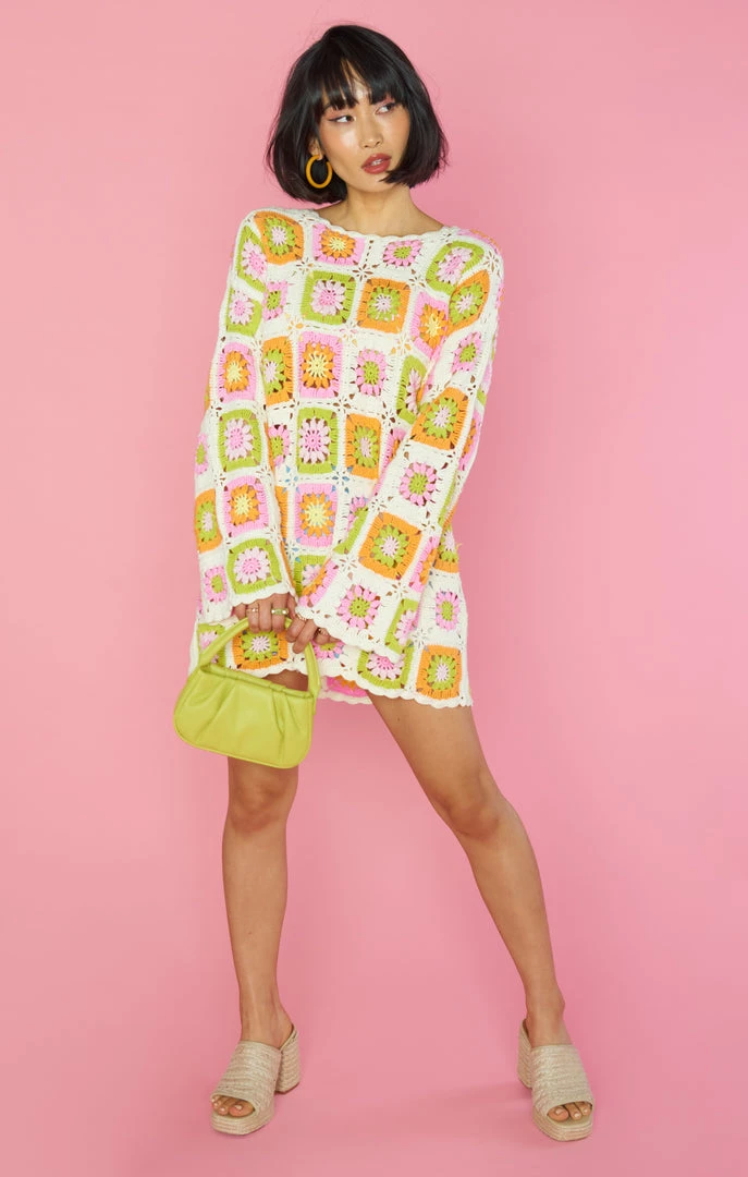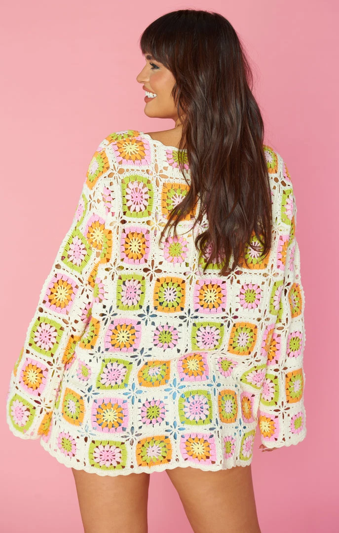 The 60’s are calling and you need to be answering in this multi-colored crochet coverup. Bell sleeves for the boho inspo, and the relaxed fit for beach babe days. This fits like a tunic, so to achieve more length, we suggest sizing up one or two sizes.