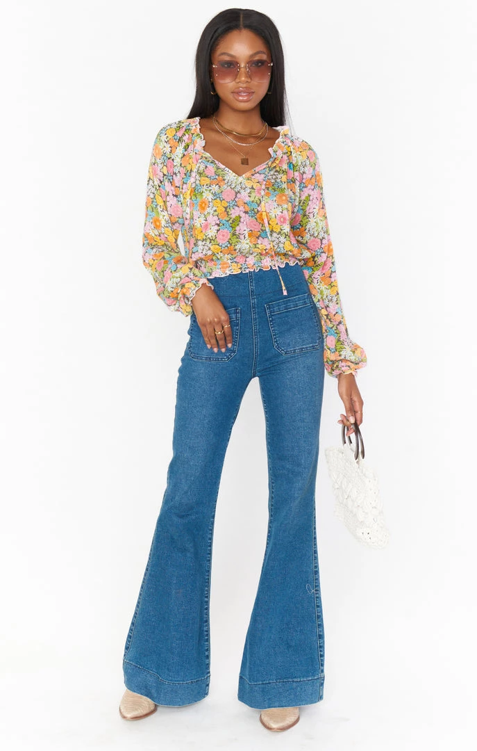 THIS is the top! Tie closure at the neck and a flounce sleeve bring the flair, while the elastic waist accentuates your figure. Grab your fave Mumu denim, throw on some booties, and you are good to be the cutest one around town.