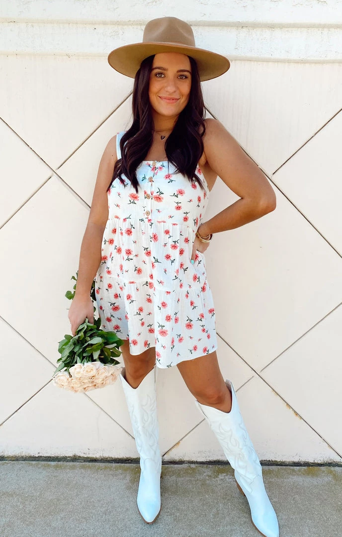 The Marisa is a breezy everyday dress with thick straps and flowy tiered hem. She has an adorable pink floral print and classic button-front closure making this extremely soft mini an everyday essential