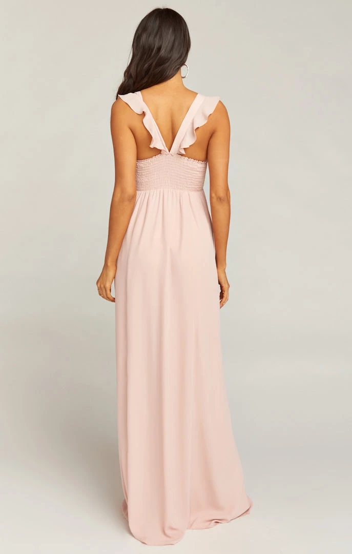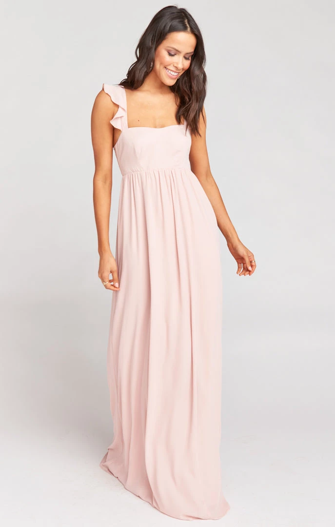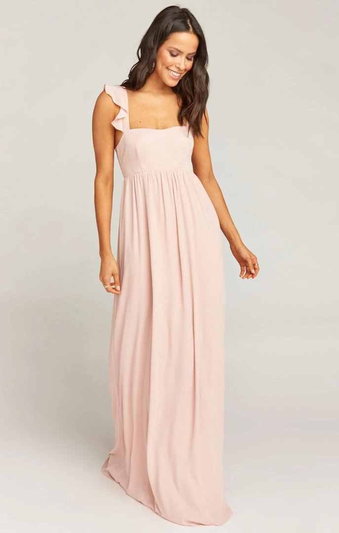 The June Maxi Dress is a bridesmaid dress that keeps it flirty while still being elegant. This dress features ruffle detailing along the straps, a smocked elastic back panel for a perfect fit, and an empire waist met with a full skirt.