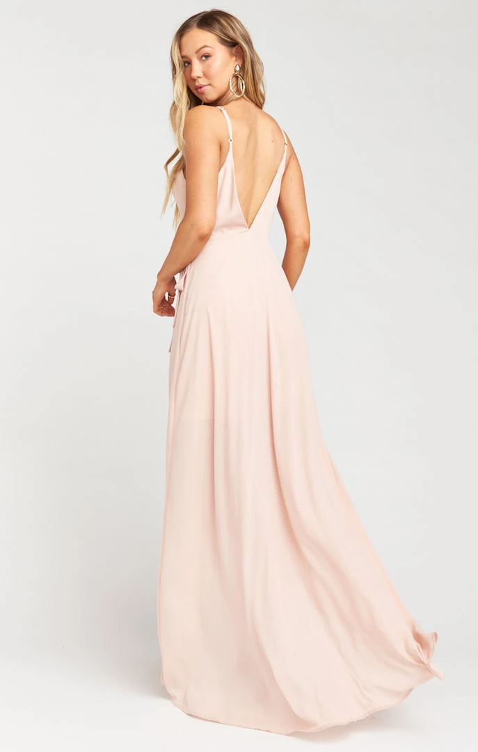 The Meghan Wrap Dress a classic high-low wrap dress great as a bridesmaid or guest. Spaghetti straps dip to a deep front and back V, while the wrap ties at the waist to cinch and flatter