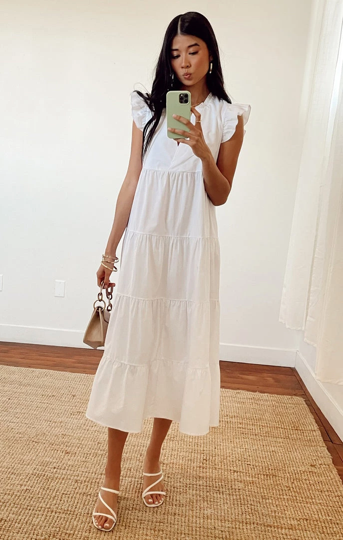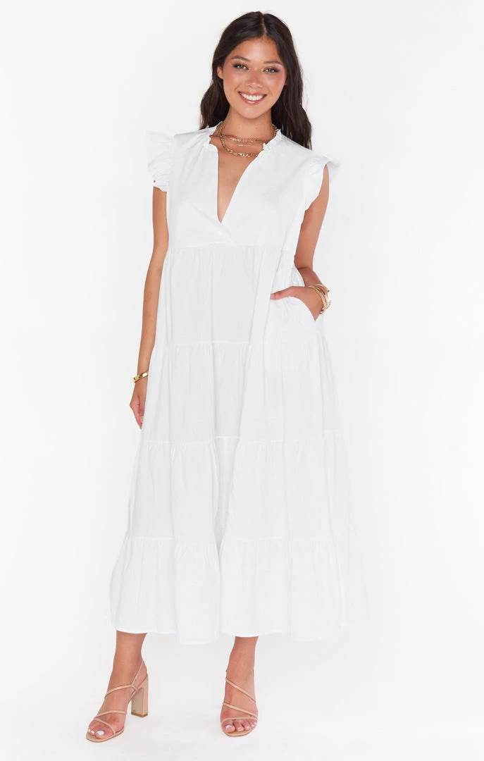 Not your mama’s white midi dress! Dress her up or dress her down, the tiered shearing and ruffled collar and cap sleeve give it an elevated look, while the elastic waist and pockets make it practical enough for taking on the day!