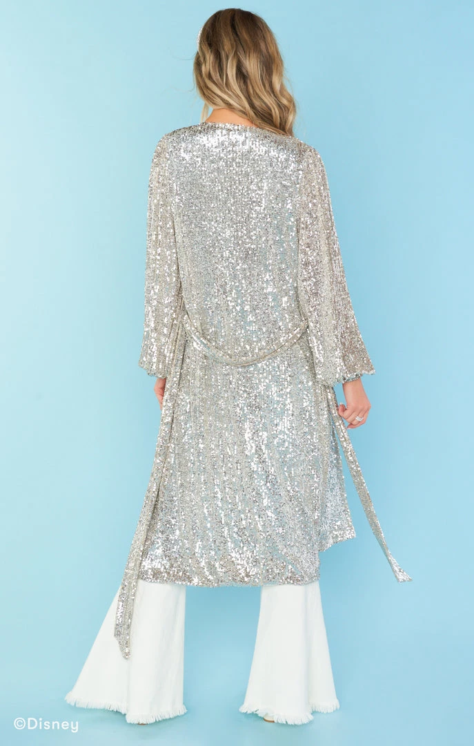 No matter what the time this silver sequin overcoat is sure to make you shine. Balloon sleeves and a detachable tie make this an easy wear over a graphic tee and denim, or as an overcoat fit for a princess over a sparkly party look. Or if you’re feeling daring it can be converted to a wrap dress!