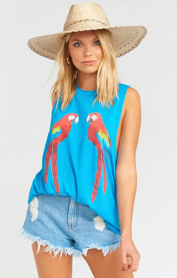 Just throw it on and go with this easy and cute muscle tank! This tank features a scoop neck and parto graphic. Pair this task with you face MuMu blues and sneakers and you’ll feel summer ready!