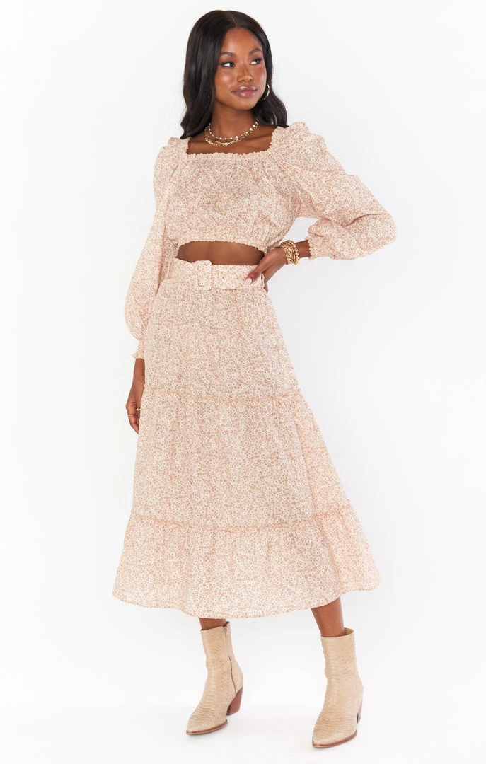 Dress her up, or dress her down, the Miley Midi Skirt is perfect for any occasion. Three tiers of lightweight fabric with a delicate floral print throughout create this flowy silhouette with a ruffled midi hem. A high waist and adjustable matching belt compliment the smallest part of your waist. Add some chunky sandals and a cute top for perfect boho vibes.