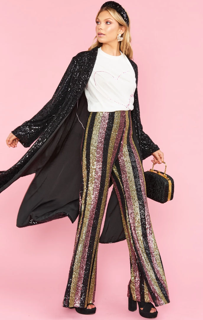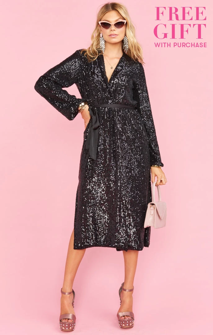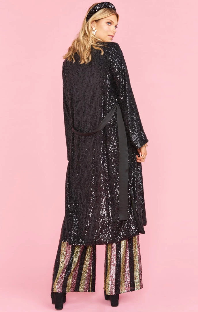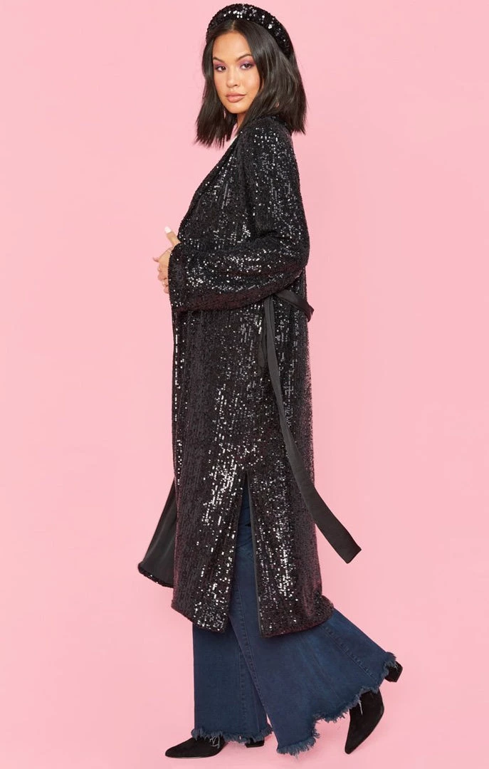 Glitz and glow in this show stopping jacket that can also be worn as a dress! This jacket features all over sequin detailing, a detachable belt and a tie front closure. Throw on this jacket and get ready to hit the after party and turn heads!