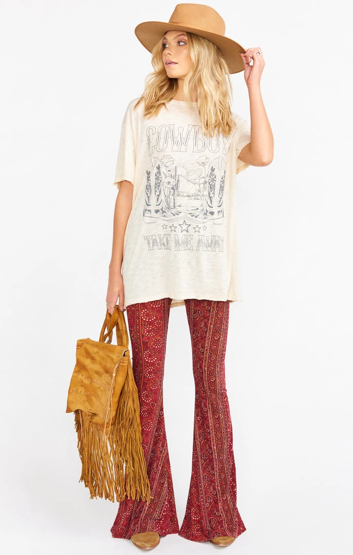 Get ready to throw on your cowboy boots and head out west in this new tee! This tee features a scoopneck with a “Cowboy Take Me Away” graphic. Giddy on up and snag this tee before its gone!