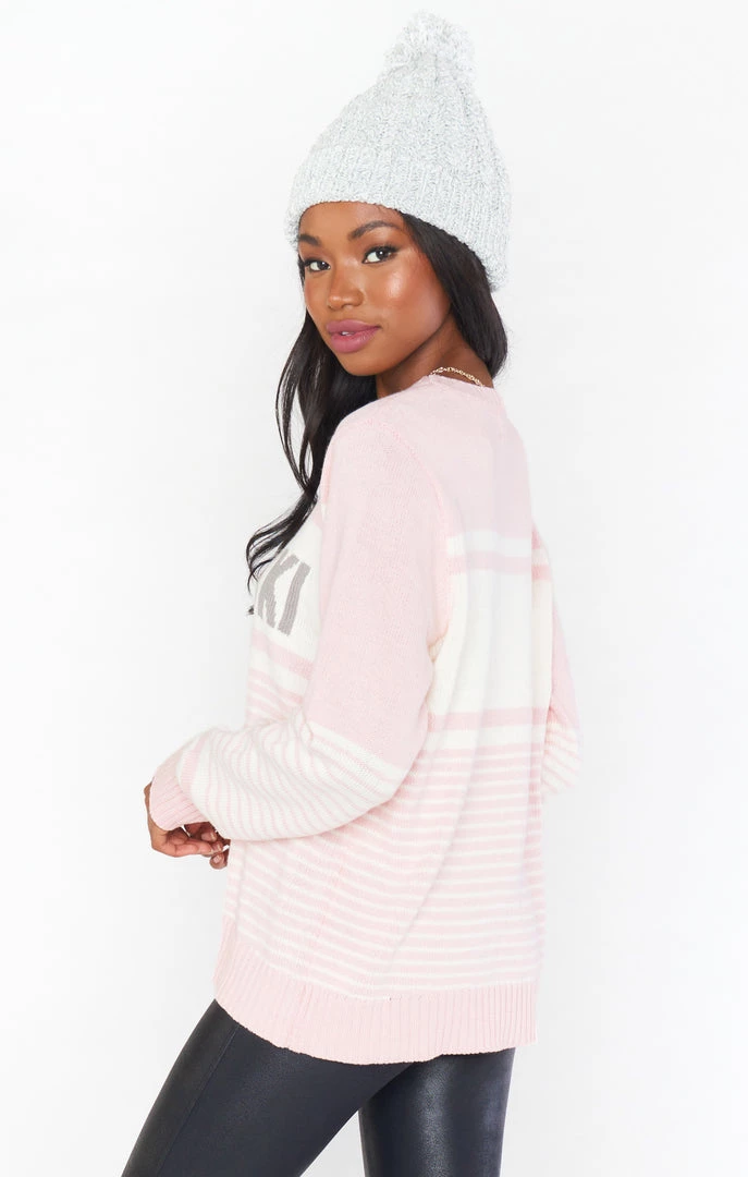 Lodge bunny or slope sweetie, this pink and white sweater will have you the most styling one on the mountain side! Cozy knit fabric with striped detailing and Apres Ski graphic.