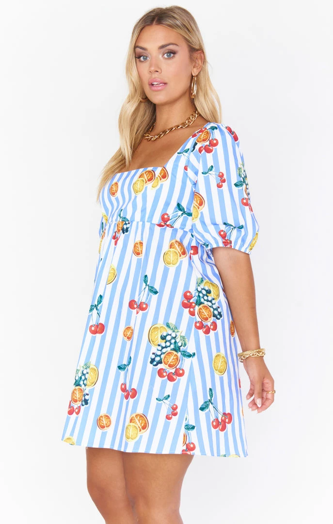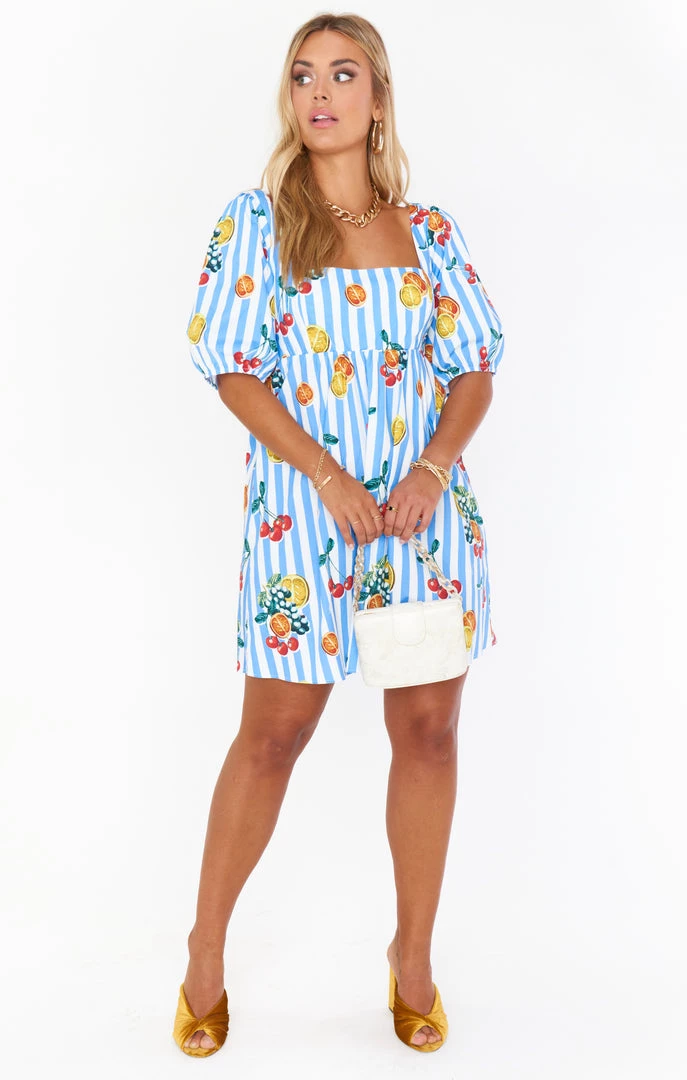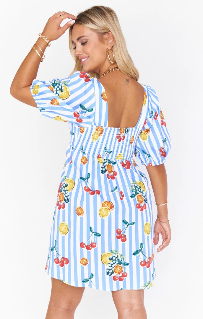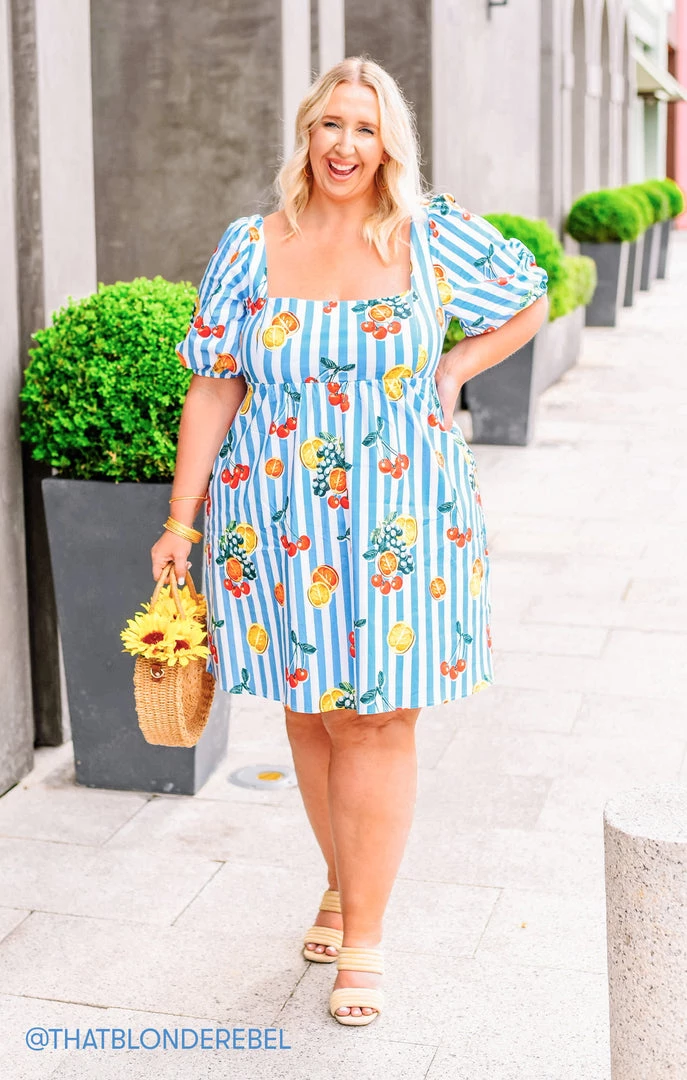 You will be feeling the love in this fruity babydoll dress! A cool square neckline next to perfectly poofed sleeves are perfectly contrasted to flatter a range of bust sizes, some extra length for added coverage and the elastic smocking in the back allows for a perfect fit!
