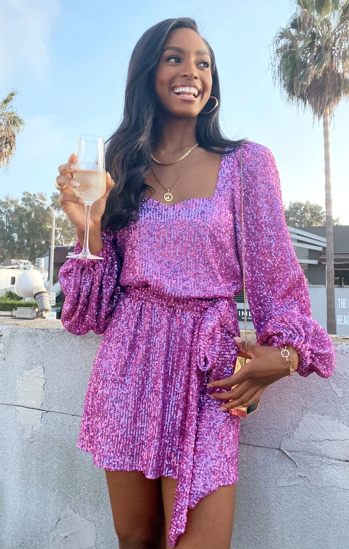 This sequined beauty is everything you want in a mini dress. Bubble sleeves, sweetheart neckline, and a removable tie at the waist make this dress so fun and flattering! Plus we are obsessed with our remarkably comfortable magenta sequin, the perfect fabric for your special night!