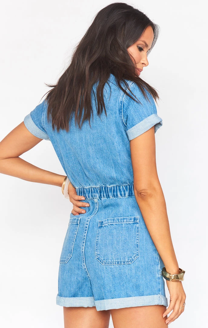 The Cannon is a denim romper that is effortlessly chic and easy to throw on! Her button up front lets you control how much skin you show and her flattering elastic waist keeps her a little more fitted while still being comfortable.