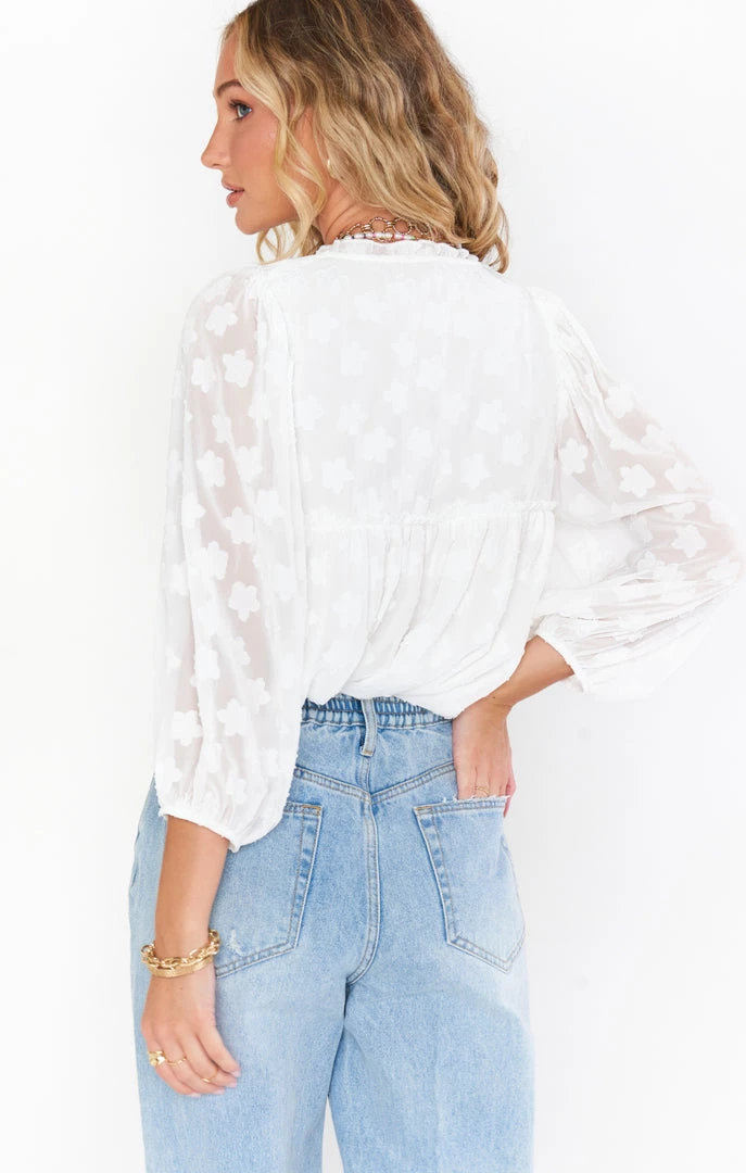 Be a daisy darling in this white floral babydoll top. Dainty stitched flower detailing on Âľ length poof sleeves meet a lined body and tie closure.Â