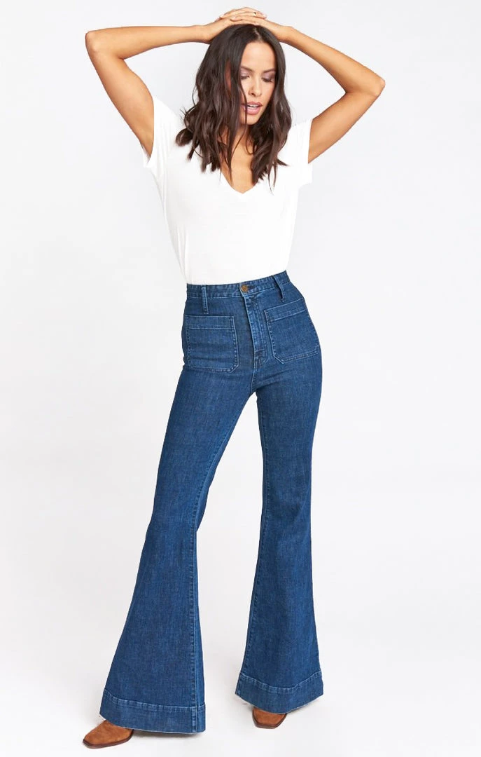 Charlie’s Favorite Mu Angel has arrived, complete with a slimming retro high waist, high pockets and the perfect 70’s flare leg! This pair of Farrahs in Downpour are gonna take you by surprise, you wont want to cover any of this true blue denim. Bright enough for a sunshiney day but dark enough to feel sleek and cool!