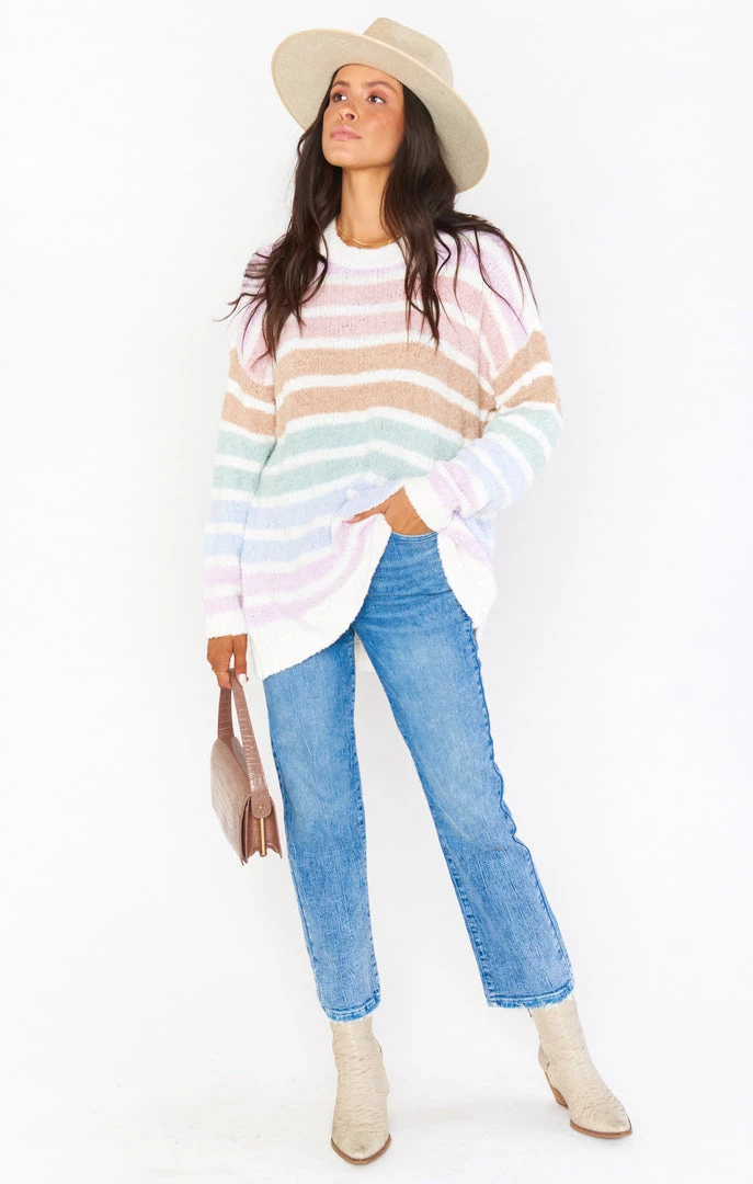 Bring on the flurries in this pastel striped chenille sweater. With a crew neck and slightly oversized fit, this soft as can be sweater is a seasonal dream.