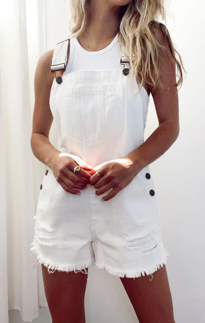 The Georgia Overalls are a denim classic done right. Their crisp white wash, distressed detailing and raw hem lend a lived-in look! These distressed overalls are great for layering with your fave MUMU bodysuit, tee, or sweater.