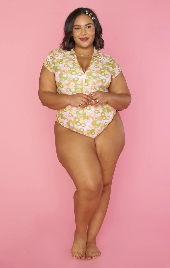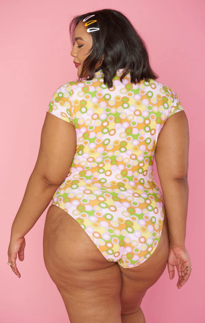 Surf’s up in this floral one piece swimsuit! Short sleeves, a retro collar and signature gold zipper elevates this special suit. Perfect for a day at the beach catching waves to catching sunsets.