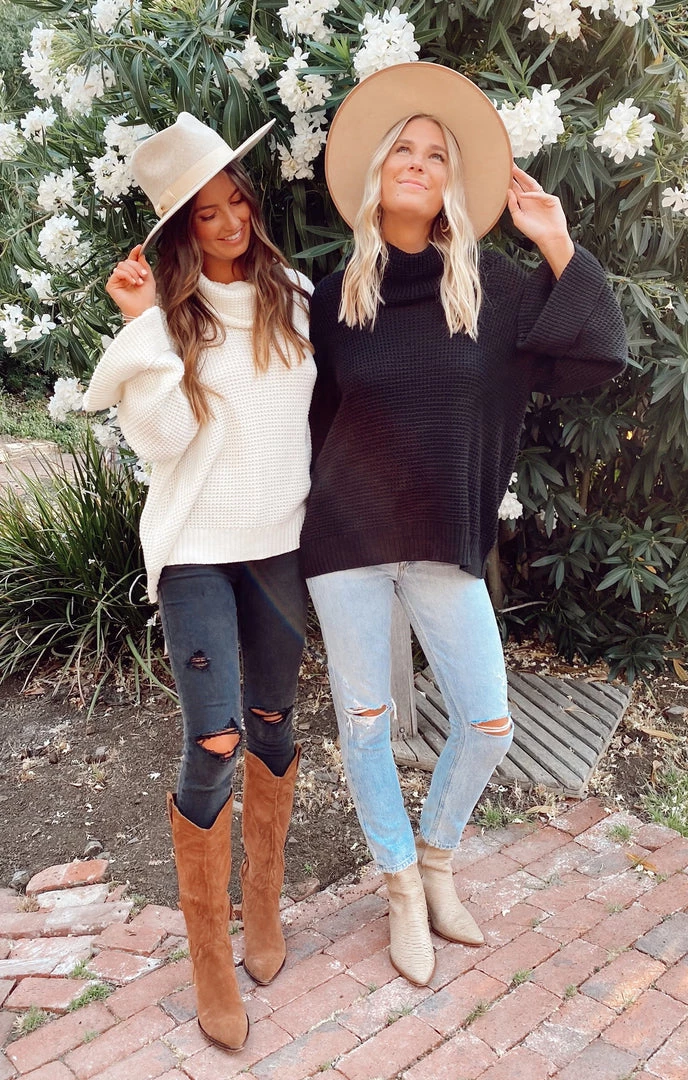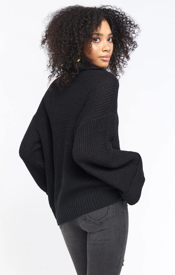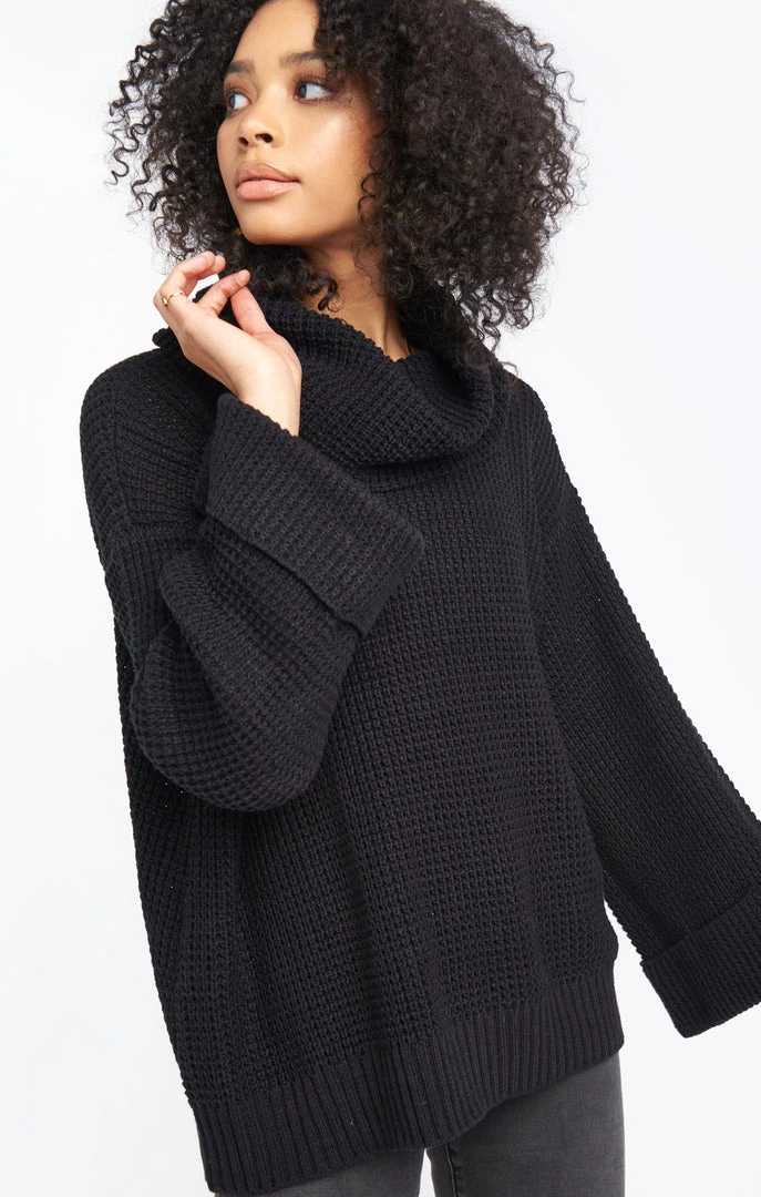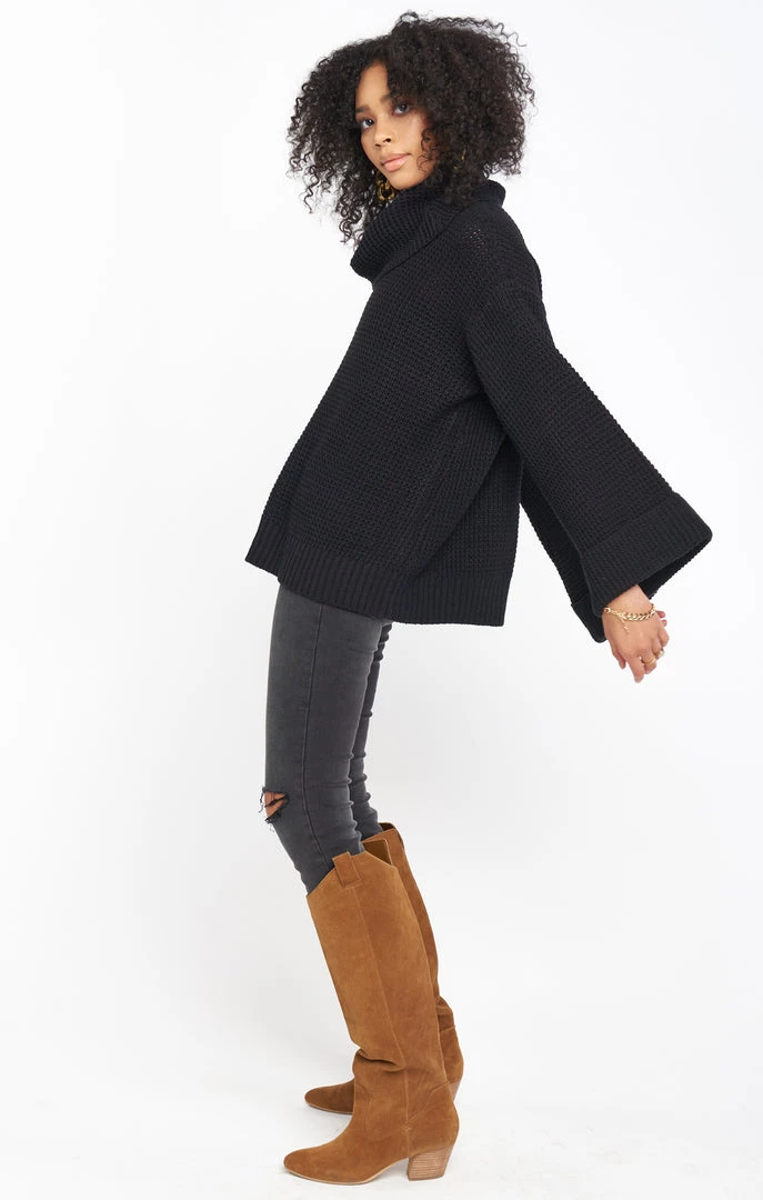 This oversized black turtleneck sweater is a cool weather must have. Cuffed sleeves are slightly belled and the turtleneck has a slouch to it for max comfort while still looking chic.