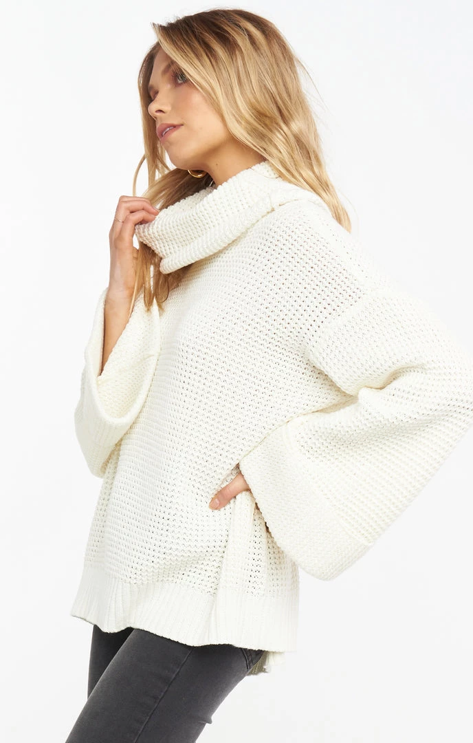 This oversized cream turtleneck sweater is a cool weather must have. Cuffed sleeves are slightly belled and the turtleneck has a slouch to it for max comfort while still looking chic