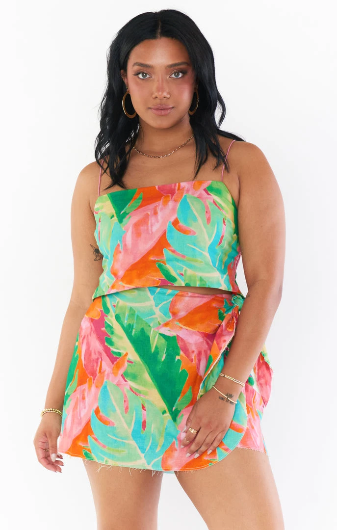 The Iva is a lightweight linen mini skirt with an effortless wrap, she has one tie side to give a little cinch and a zipper on the other so there are no slips. Her raw edged hem screams carefree summer whether paired with a new Tropics Palm bikini or a matching Tula Crop Top!