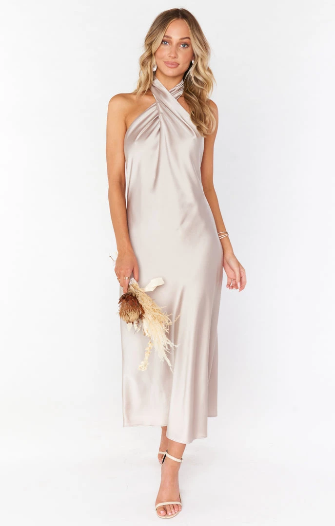 Show Me Your Mumu New Mu Jasmine Halter Midi Dress ~ Show Me The Ring Luxe Satin