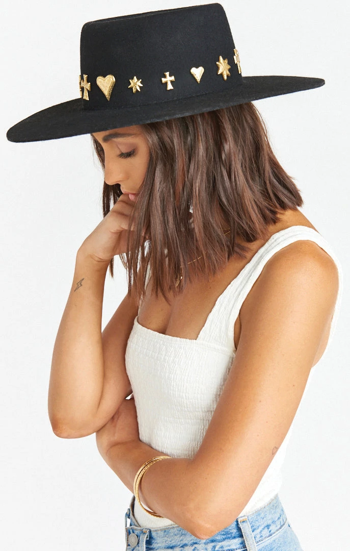The chicest hat we have ever laid our eyes on. Classic black dipped boater silhouette with custom made gold LOC conchos!