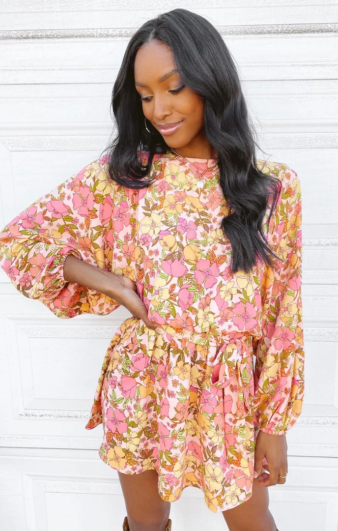 Look no further for the best bright floral mini dress perfect for any occasion! Large bubble dolman sleeves and a flowy silhouette make this dress easy to thrown on and comfortable all day long! Use the removable tie to cinch around the waist or leave it loose for a casual look!