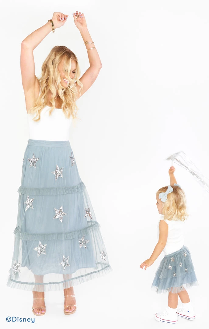Three layers of adorable tulle and sequin stars make this little skirt a must for your little one! Matches Mama’s Star Top and Skirt look!