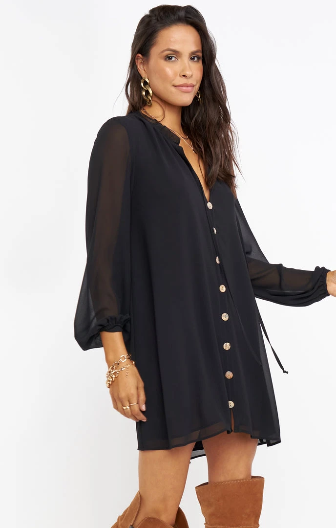 Flowy and effortlessly chic, this black mini dress is hard to beat! This button up dress has a ruffled detailing at the collar accented with a tie and voluminous balloon sleeves to flatter!