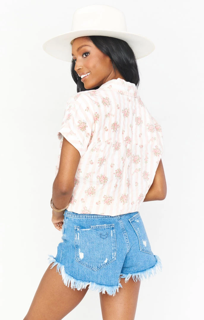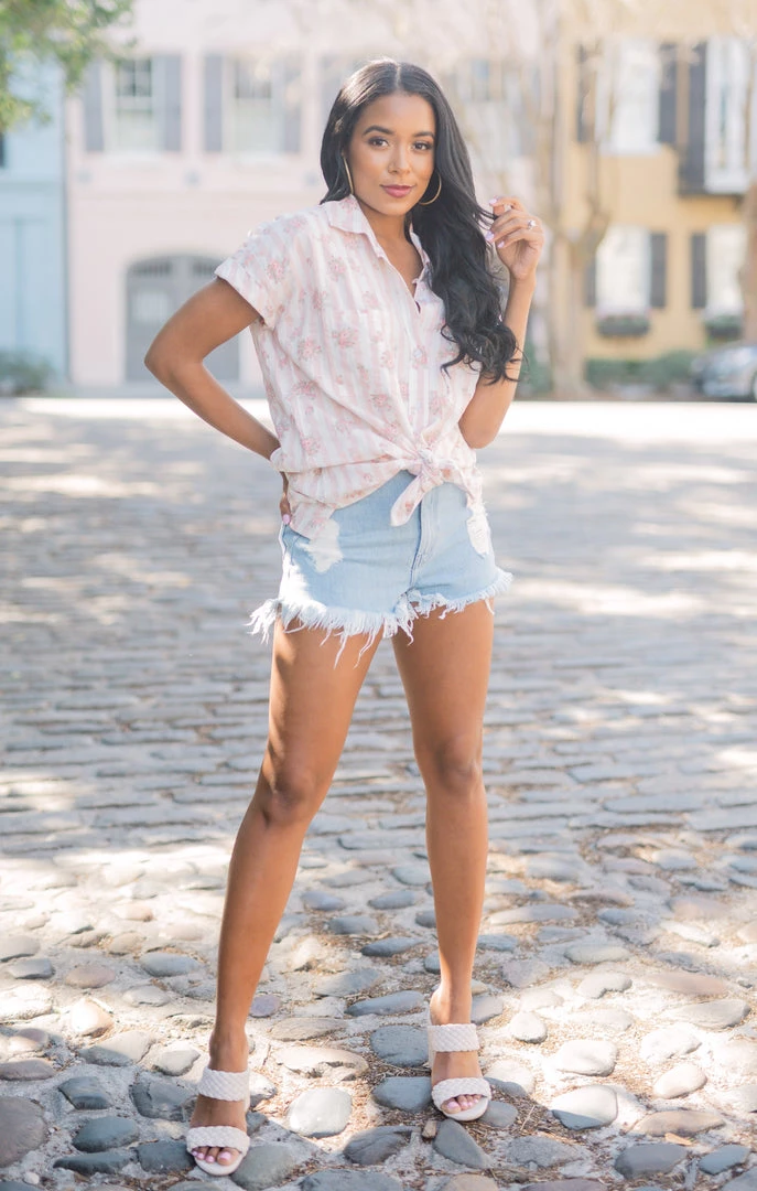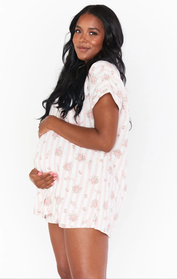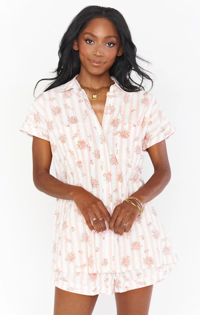 A must for any girl that loves to mix + match, this pink and white striped set can go from the bedroom to a casual brunch to the beach thanks to the flowy button up top and matching shorts with an elastic and drawstring waistband.