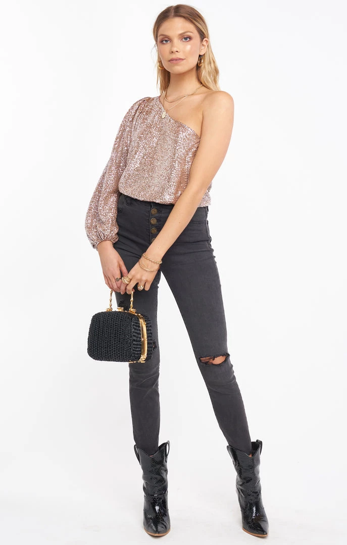 The ultimate update to our classic one shoulder top. We added a gorgeous lantern sleeve in our silver confetti sparkle for a stand out holiday look. You will love this flattering top that pairs perfect tucked into a pair of jeans or a mini skirt